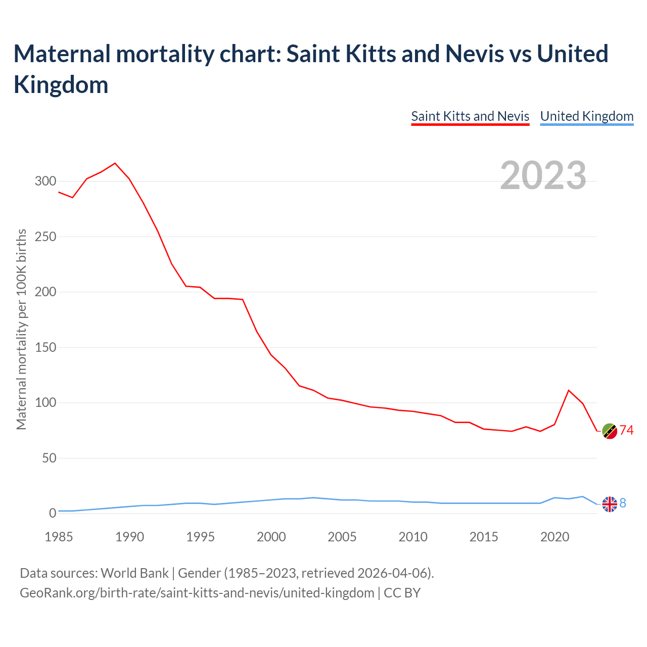 The maternal mortality rate, which is the probability of dying during childbirth or within 42 days of pregnancy termination, is 74 deaths per 100,000 live births in Saint Kitts and Nevis, compared to 8 deaths in the United Kingdom.