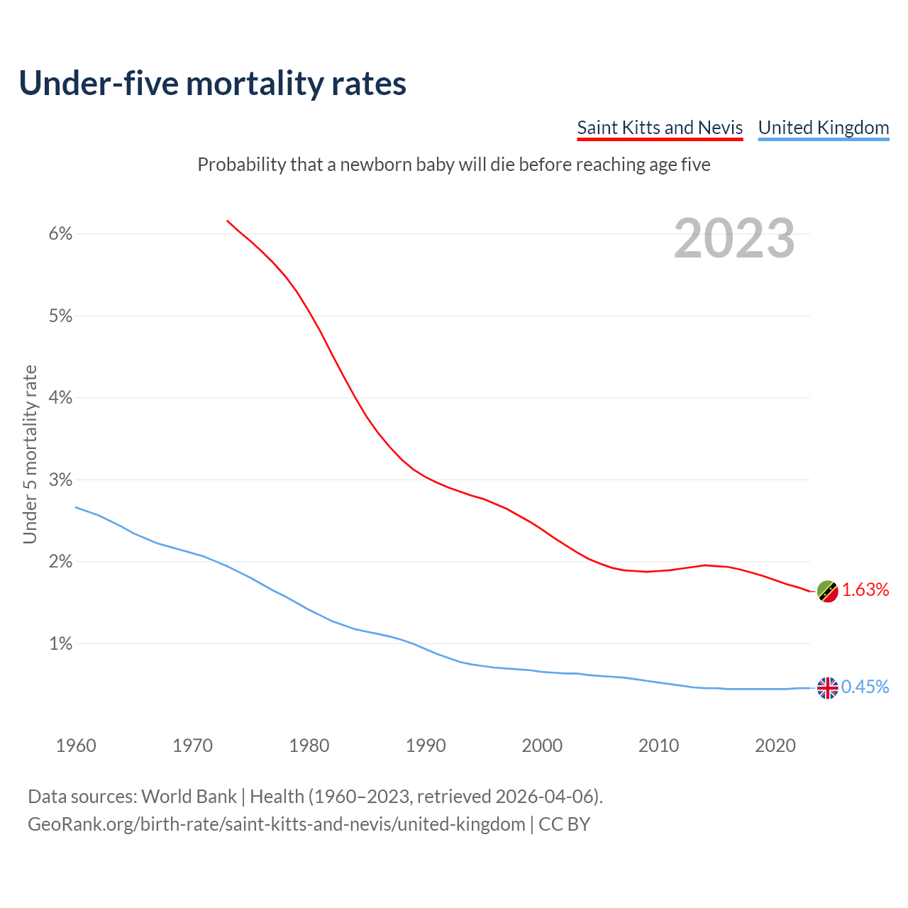 The chance that a newborn baby will die before reaching age five is 1.63% in Saint Kitts and Nevis and 0.45% in the United Kingdom. Above is a chart with historical data on under-five mortality rates.