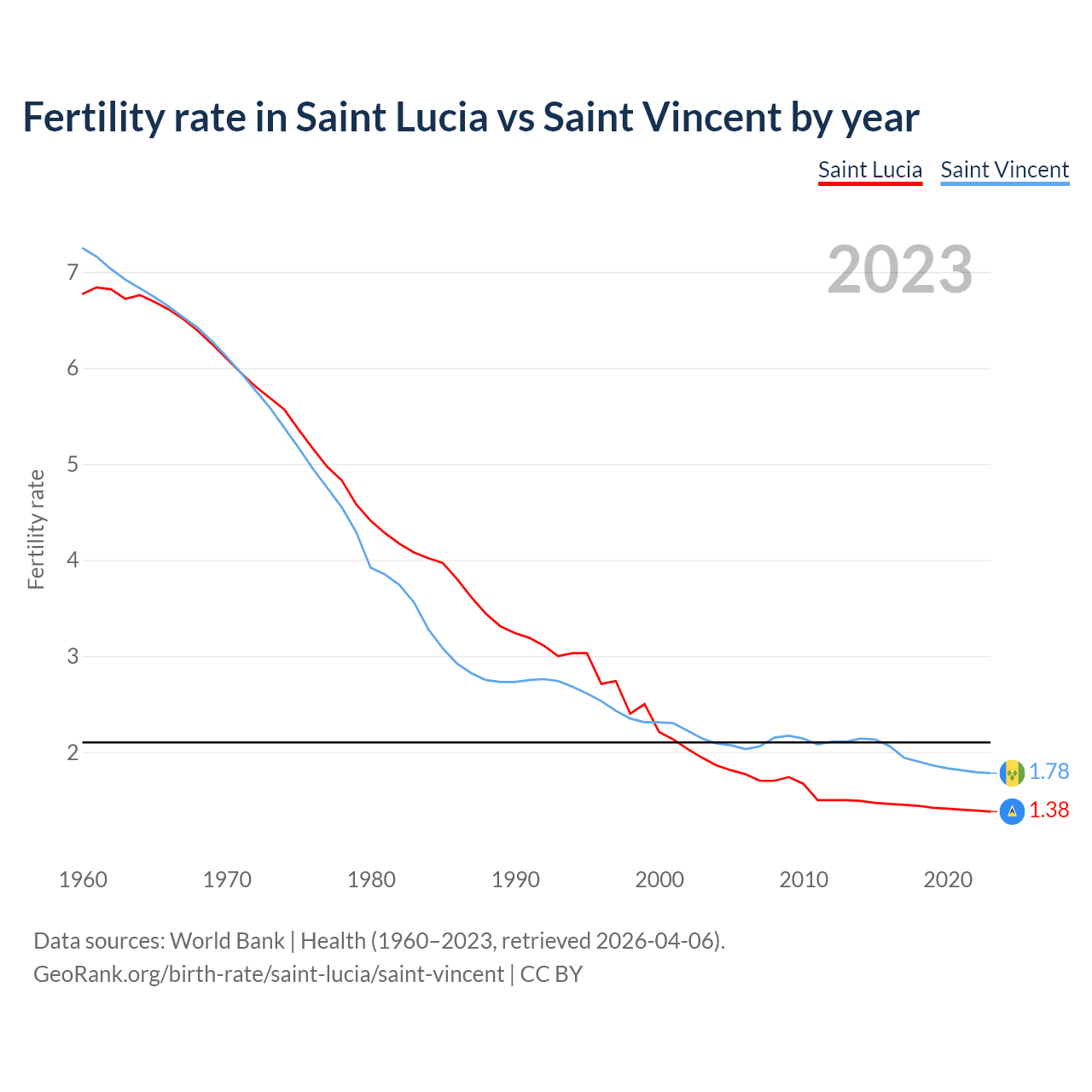 1960 vs 2023, the fertility rate has decreased by 79.6% in Saint Lucia and by 75.5% in Saint Vincent — in 1960, it was 6.77 and 7.25, respectively.