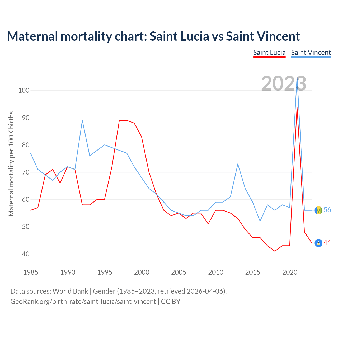 The maternal mortality rate, which is the probability of dying during childbirth or within 42 days of pregnancy termination, is 44 deaths per 100,000 live births in Saint Lucia, compared to 56 deaths in Saint Vincent.