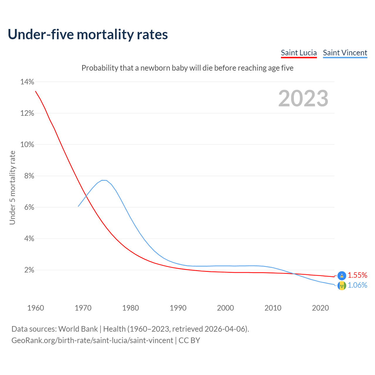 The chance that a newborn baby will die before reaching age five is 1.55% in Saint Lucia and 1.06% in Saint Vincent. Above is a chart with historical data on under-five mortality rates.