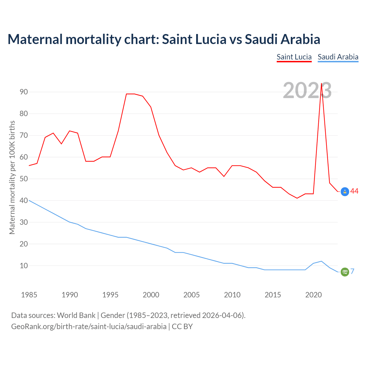 The maternal mortality rate, which is the probability of dying during childbirth or within 42 days of pregnancy termination, is 44 deaths per 100,000 live births in Saint Lucia, compared to 7 deaths in Saudi Arabia.