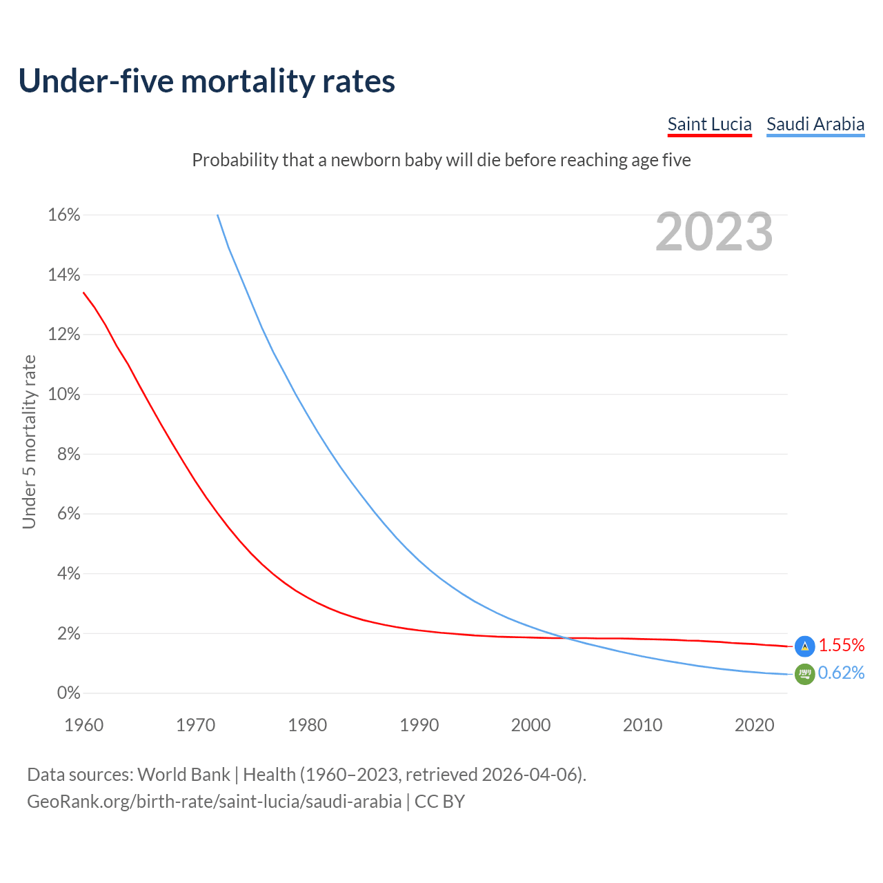 The chance that a newborn baby will die before reaching age five is 1.55% in Saint Lucia and 0.62% in Saudi Arabia. Above is a chart with historical data on under-five mortality rates.
