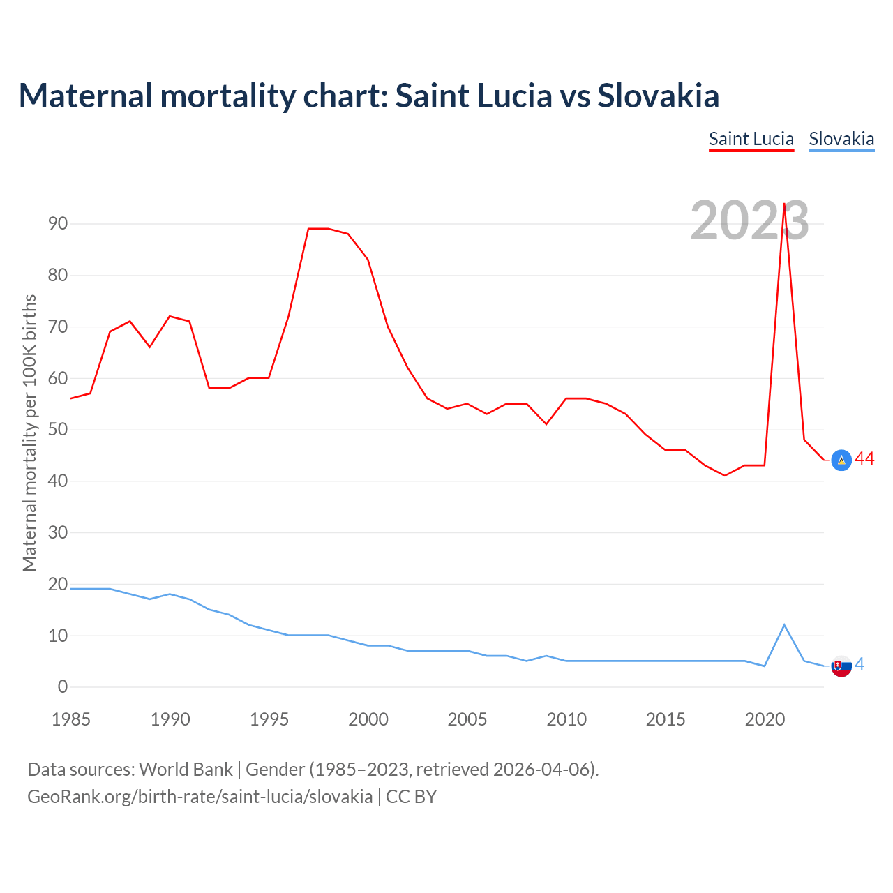 The maternal mortality rate, which is the probability of dying during childbirth or within 42 days of pregnancy termination, is 44 deaths per 100,000 live births in Saint Lucia, compared to 4 deaths in Slovakia.