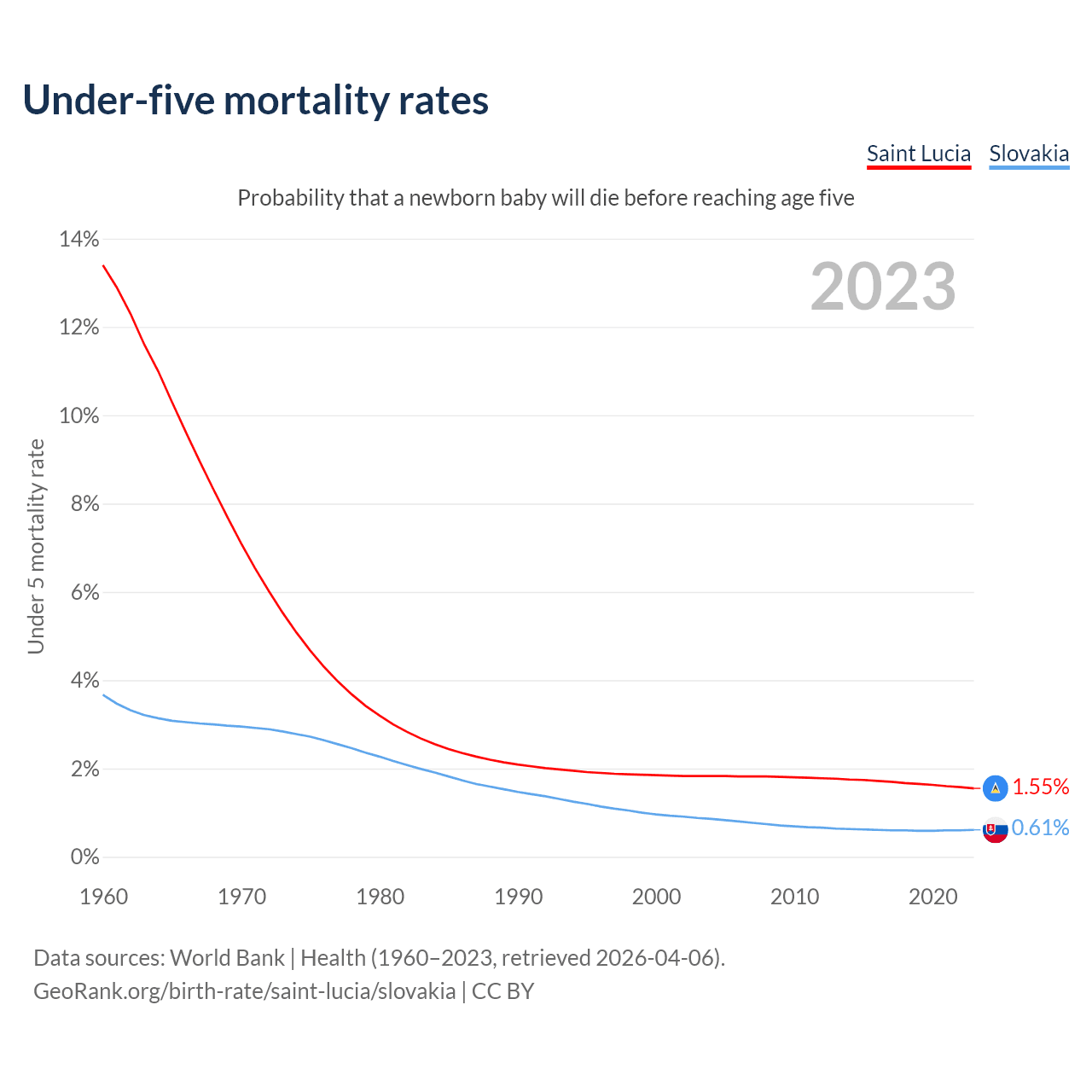 The chance that a newborn baby will die before reaching age five is 1.55% in Saint Lucia and 0.61% in Slovakia. Above is a chart with historical data on under-five mortality rates.