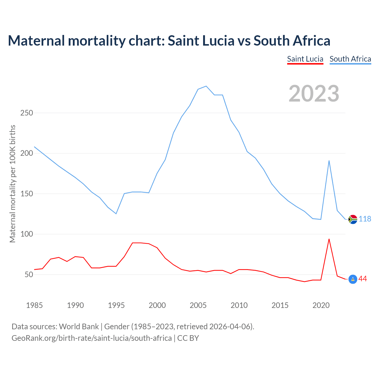 The maternal mortality rate, which is the probability of dying during childbirth or within 42 days of pregnancy termination, is 44 deaths per 100,000 live births in Saint Lucia, compared to 118 deaths in South Africa.