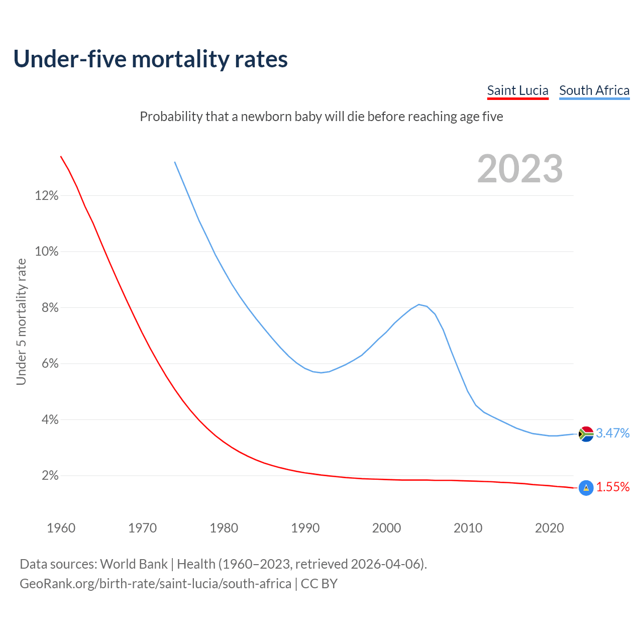 The chance that a newborn baby will die before reaching age five is 1.55% in Saint Lucia and 3.47% in South Africa. Above is a chart with historical data on under-five mortality rates.