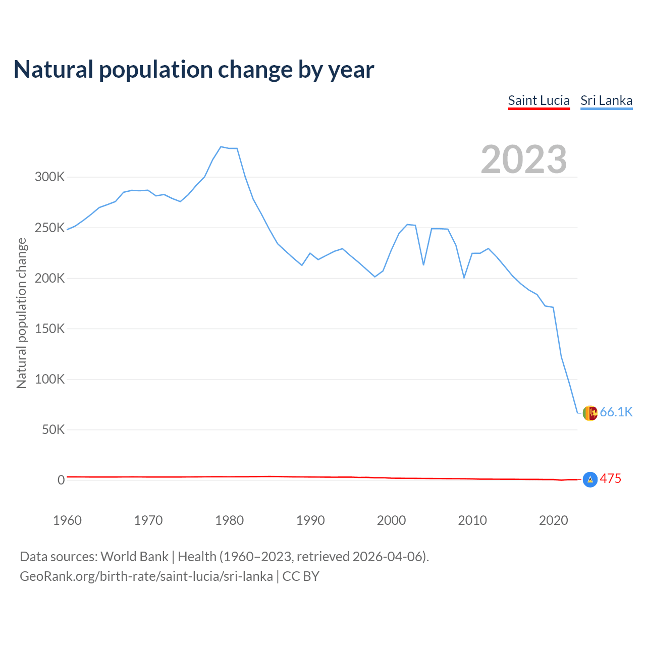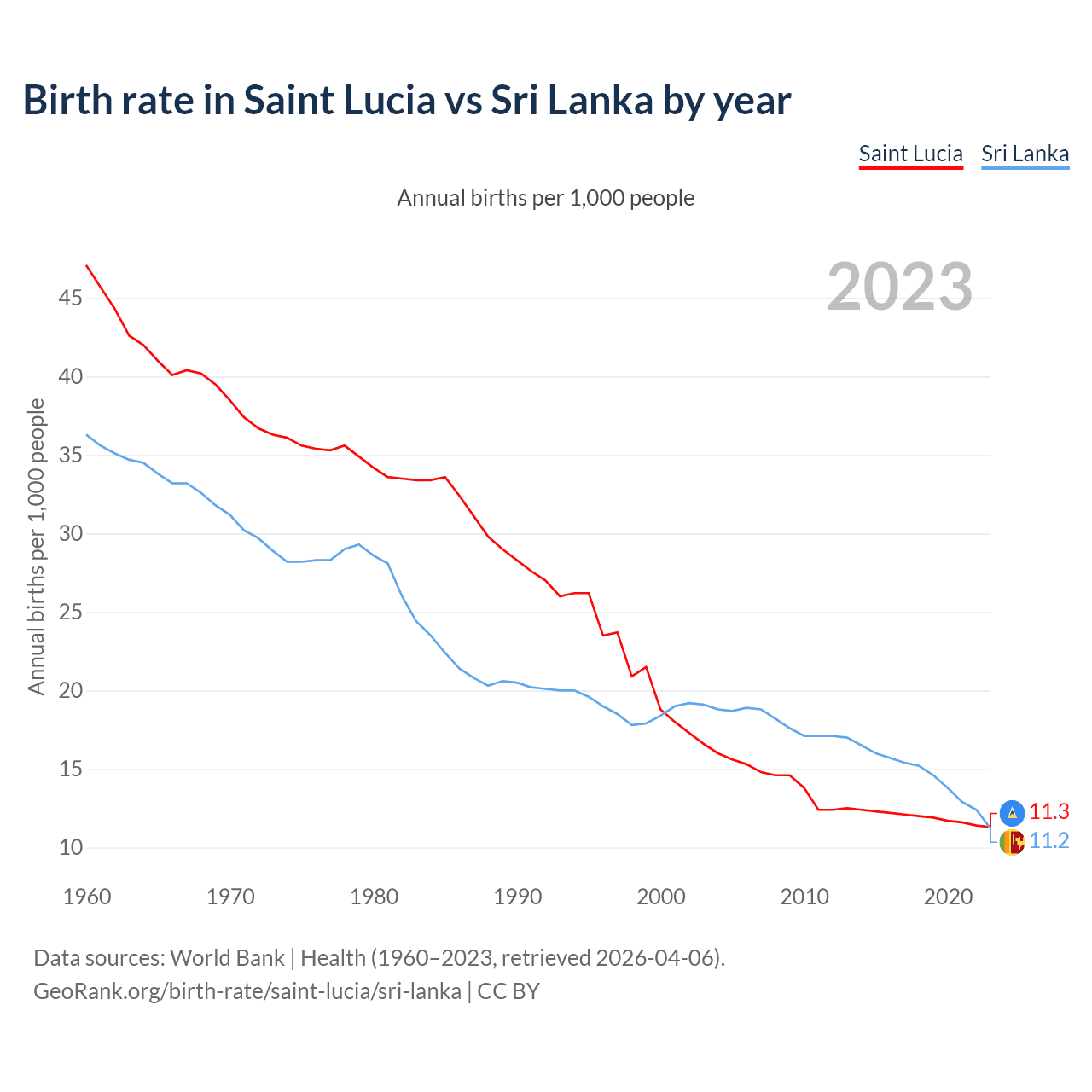 Saint Lucia has an annual birth rate of 11.3 births per 1,000 people, compared to 11.2 for Sri Lanka. The average number of children a woman is expected to have during her lifetime — the fertility rate, is 1.38 in Saint Lucia and 1.97 in Sri Lanka — 43.1% difference.