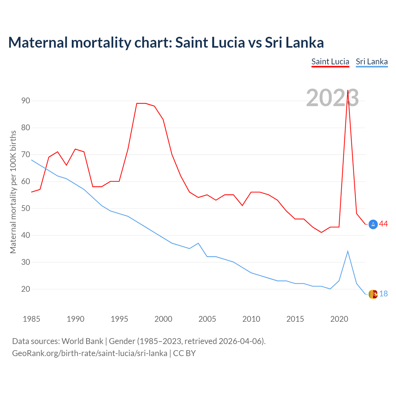 The maternal mortality rate, which is the probability of dying during childbirth or within 42 days of pregnancy termination, is 44 deaths per 100,000 live births in Saint Lucia, compared to 18 deaths in Sri Lanka.