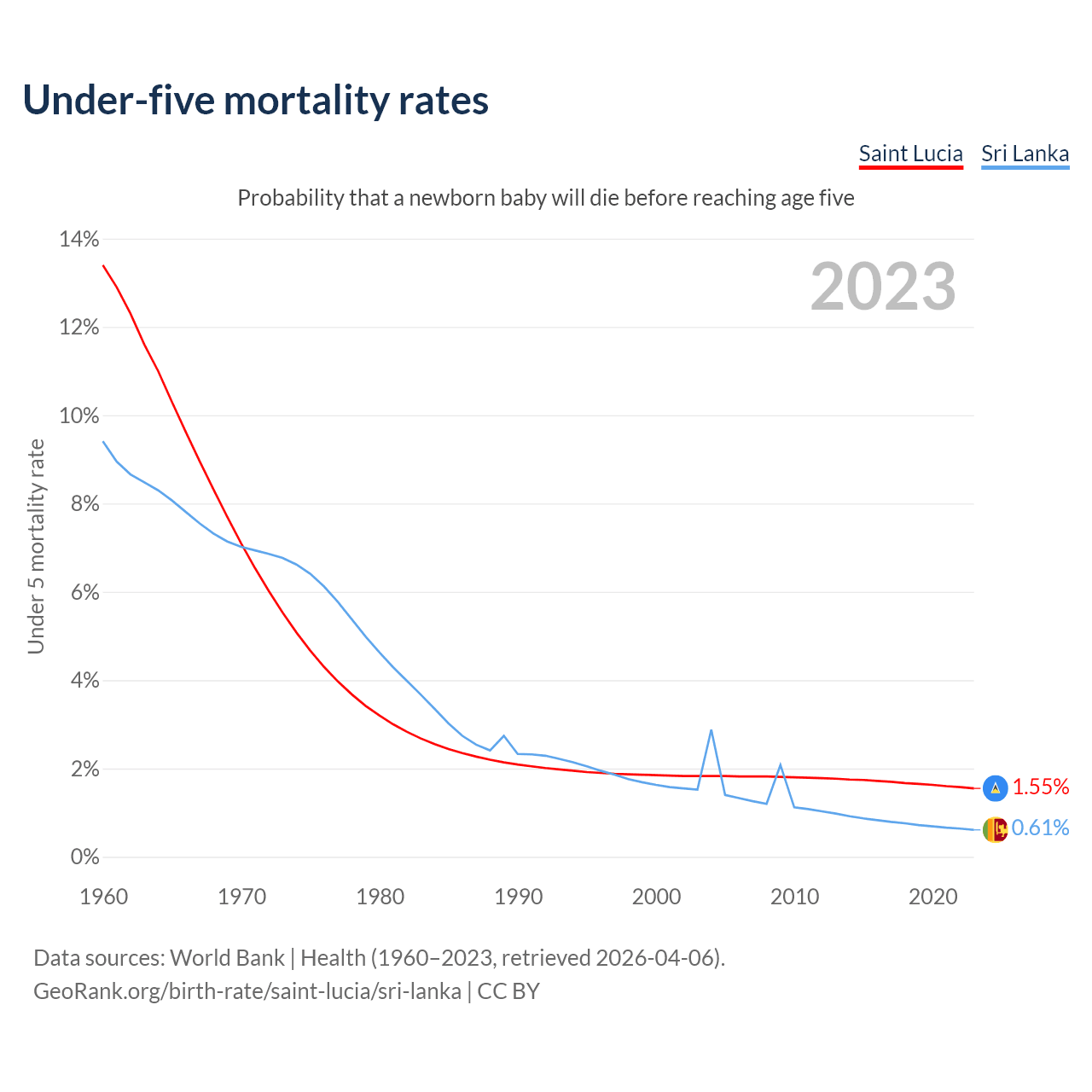 The chance that a newborn baby will die before reaching age five is 1.55% in Saint Lucia and 0.61% in Sri Lanka. Above is a chart with historical data on under-five mortality rates.