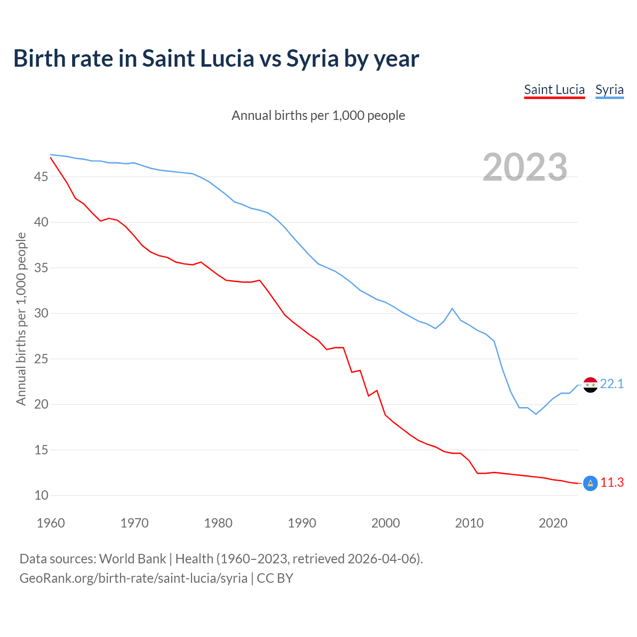 Saint Lucia has an annual birth rate of 11.3 births per 1,000 people, compared to 22.1 for Syria. The average number of children a woman is expected to have during her lifetime — the fertility rate, is 1.38 in Saint Lucia and 2.71 in Syria — 96.7% difference.