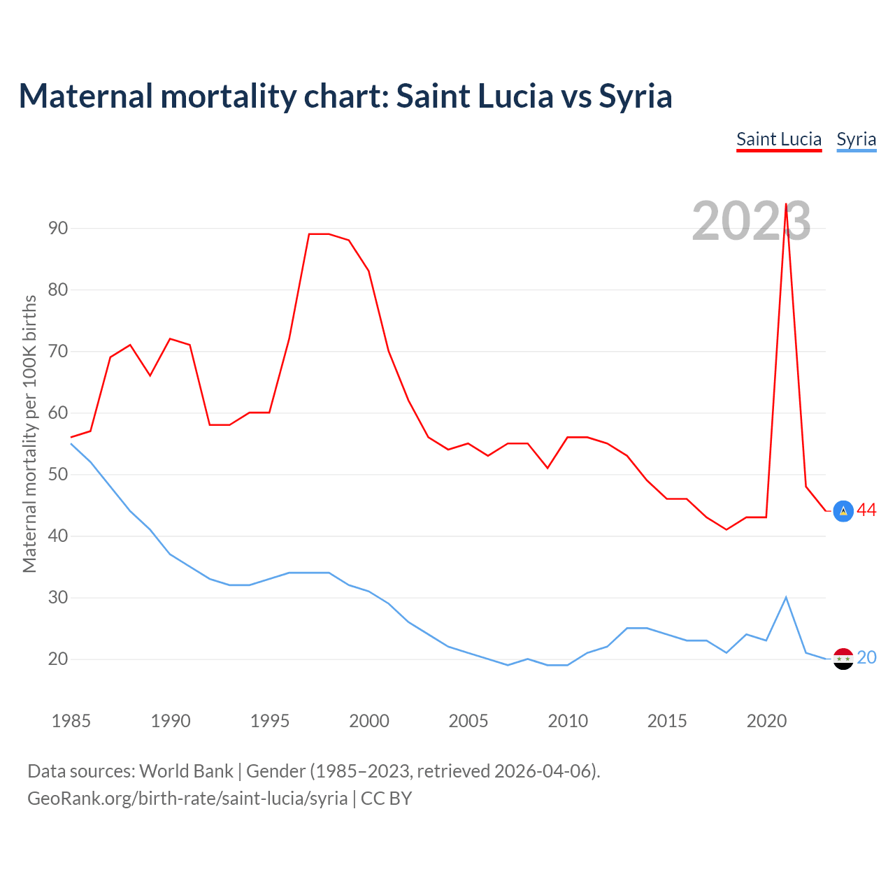 The maternal mortality rate, which is the probability of dying during childbirth or within 42 days of pregnancy termination, is 44 deaths per 100,000 live births in Saint Lucia, compared to 20 deaths in Syria.