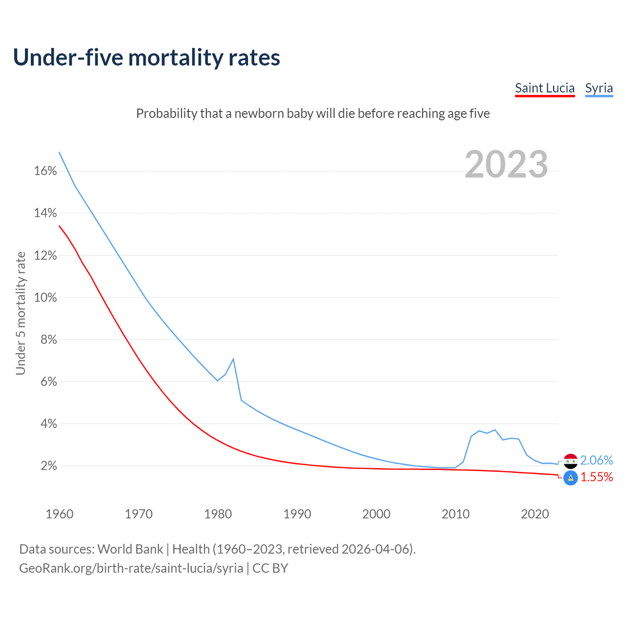 The chance that a newborn baby will die before reaching age five is 1.55% in Saint Lucia and 2.06% in Syria. Above is a chart with historical data on under-five mortality rates.