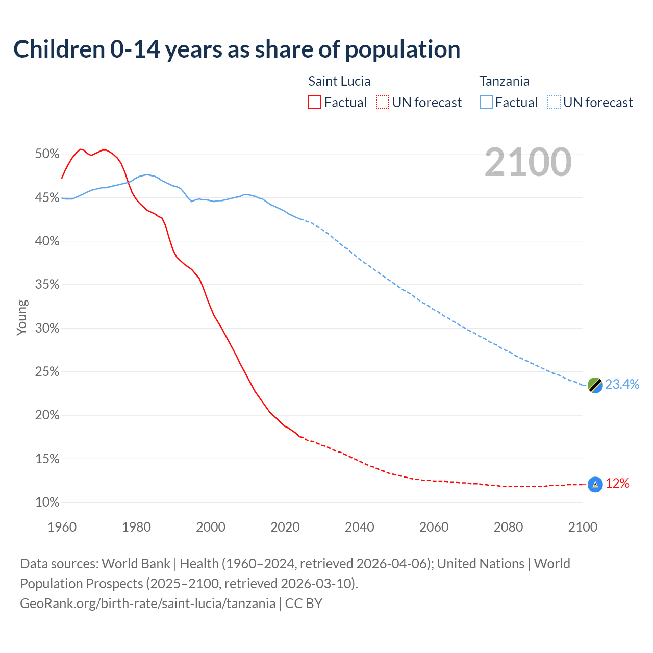 Saint Lucia has an annual birth rate of 11.3 births per 1,000 people, compared to 35.2 for Tanzania. The average number of children a woman is expected to have during her lifetime — the fertility rate, is 1.38 in Saint Lucia and 4.61 in Tanzania — 234% difference.