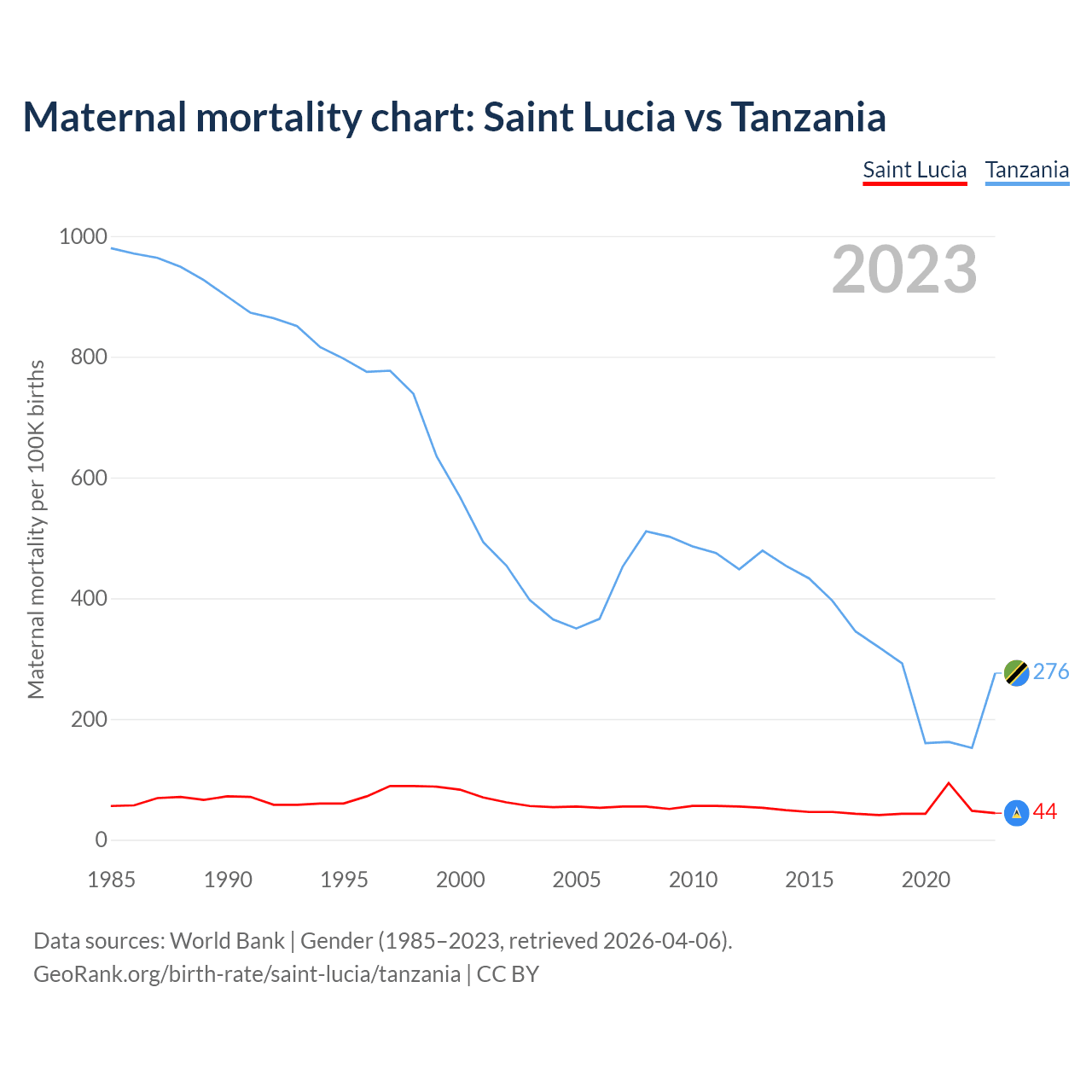 The maternal mortality rate, which is the probability of dying during childbirth or within 42 days of pregnancy termination, is 44 deaths per 100,000 live births in Saint Lucia, compared to 276 deaths in Tanzania.