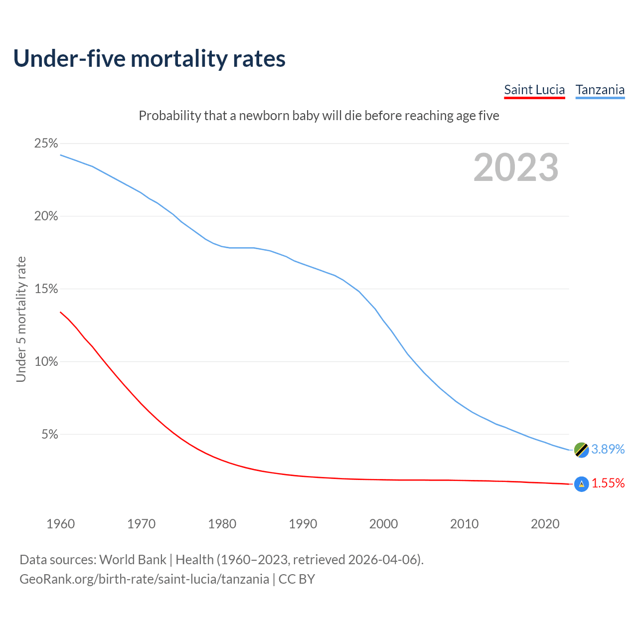 The chance that a newborn baby will die before reaching age five is 1.55% in Saint Lucia and 3.89% in Tanzania. Above is a chart with historical data on under-five mortality rates.