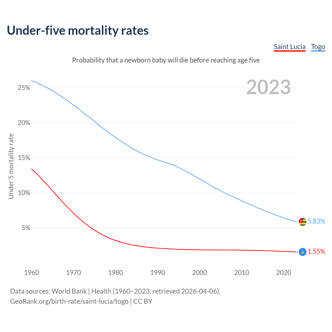 The chance that a newborn baby will die before reaching age five is 1.55% in Saint Lucia and 5.83% in Togo. Above is a chart with historical data on under-five mortality rates.