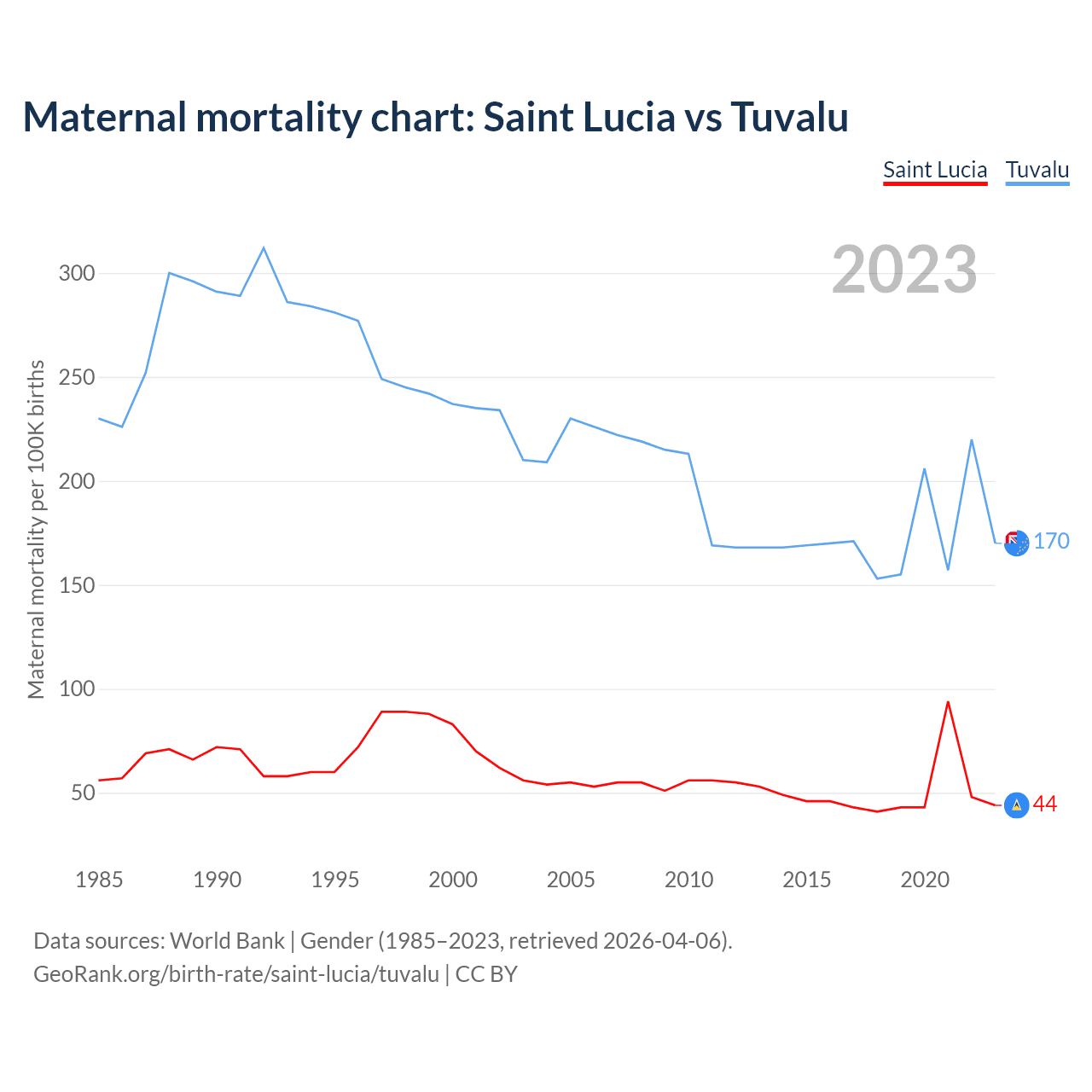 The maternal mortality rate, which is the probability of dying during childbirth or within 42 days of pregnancy termination, is 44 deaths per 100,000 live births in Saint Lucia, compared to 170 deaths in Tuvalu.