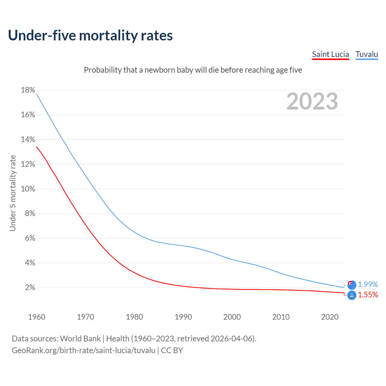 The chance that a newborn baby will die before reaching age five is 1.55% in Saint Lucia and 1.99% in Tuvalu. Above is a chart with historical data on under-five mortality rates.