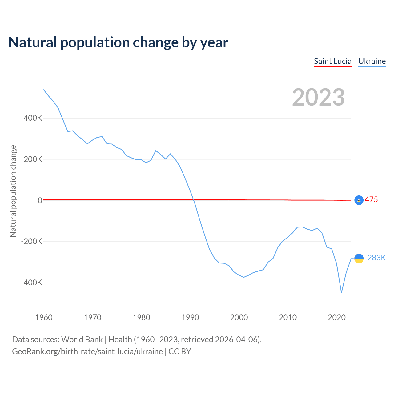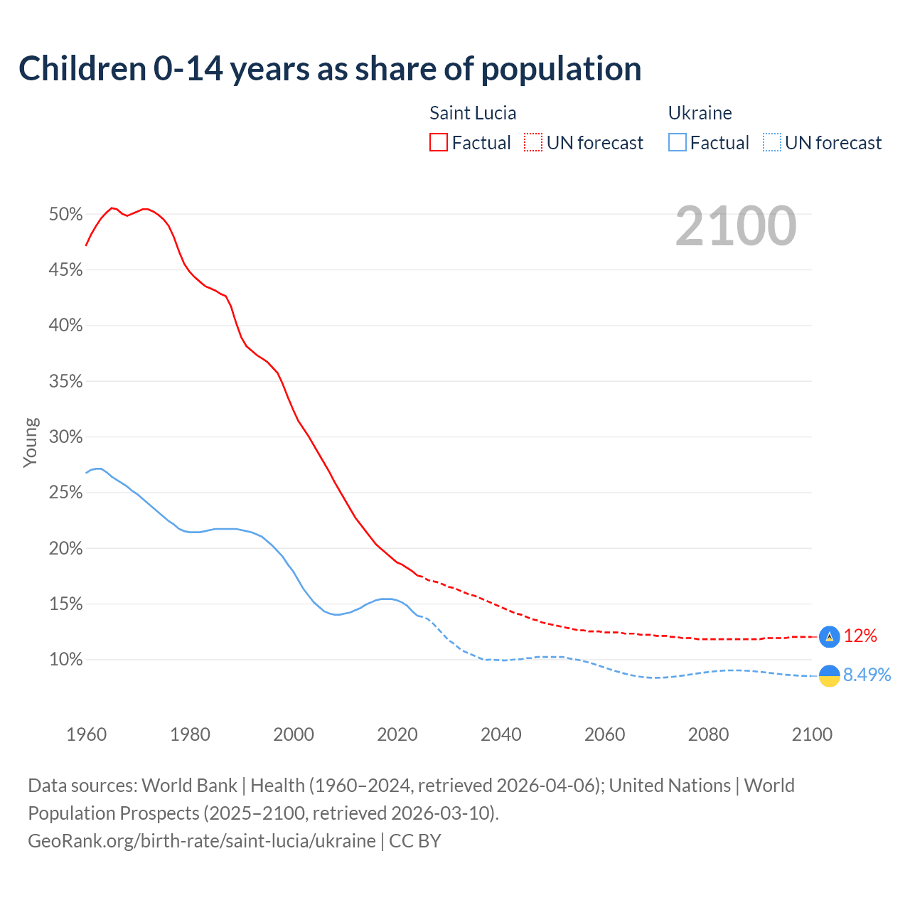 According to the latest available data on birth rates, the fertility rate in Saint Lucia was 1.38 children per woman in 2023, compared to 0.98 in Ukraine in 2023. The replacement level is considered to be 2.1 children per woman.