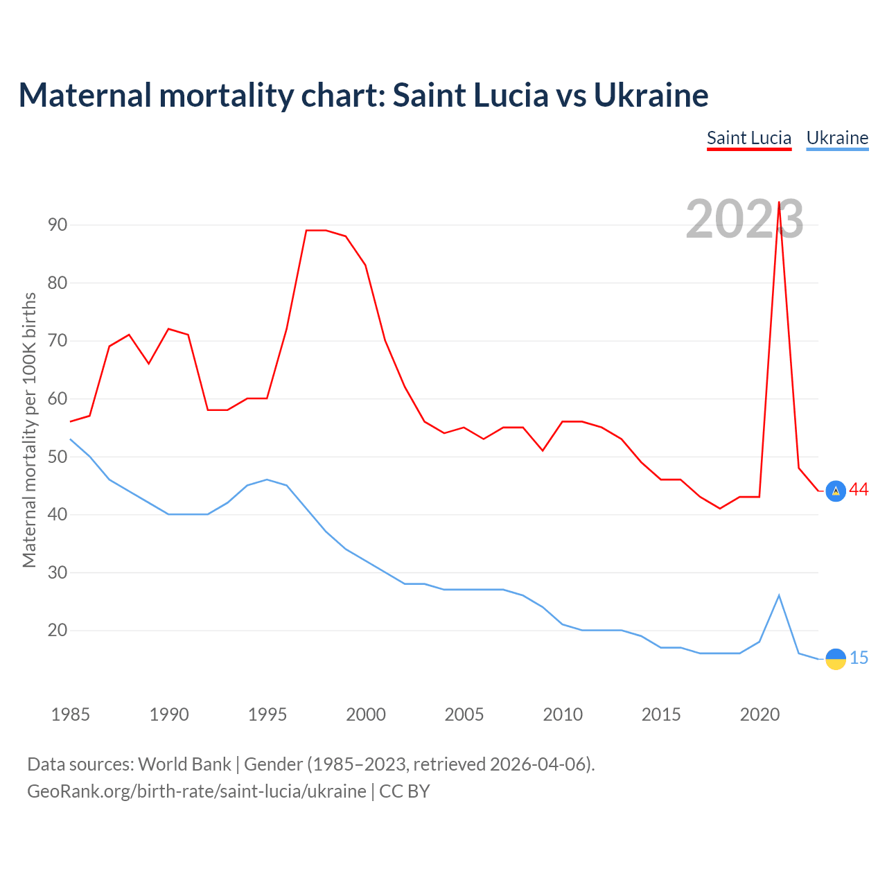The maternal mortality rate, which is the probability of dying during childbirth or within 42 days of pregnancy termination, is 44 deaths per 100,000 live births in Saint Lucia, compared to 15 deaths in Ukraine.