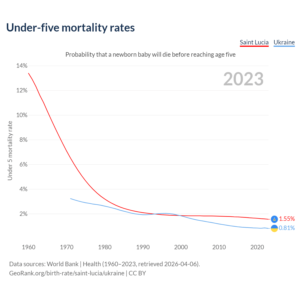 The chance that a newborn baby will die before reaching age five is 1.55% in Saint Lucia and 0.81% in Ukraine. Above is a chart with historical data on under-five mortality rates.