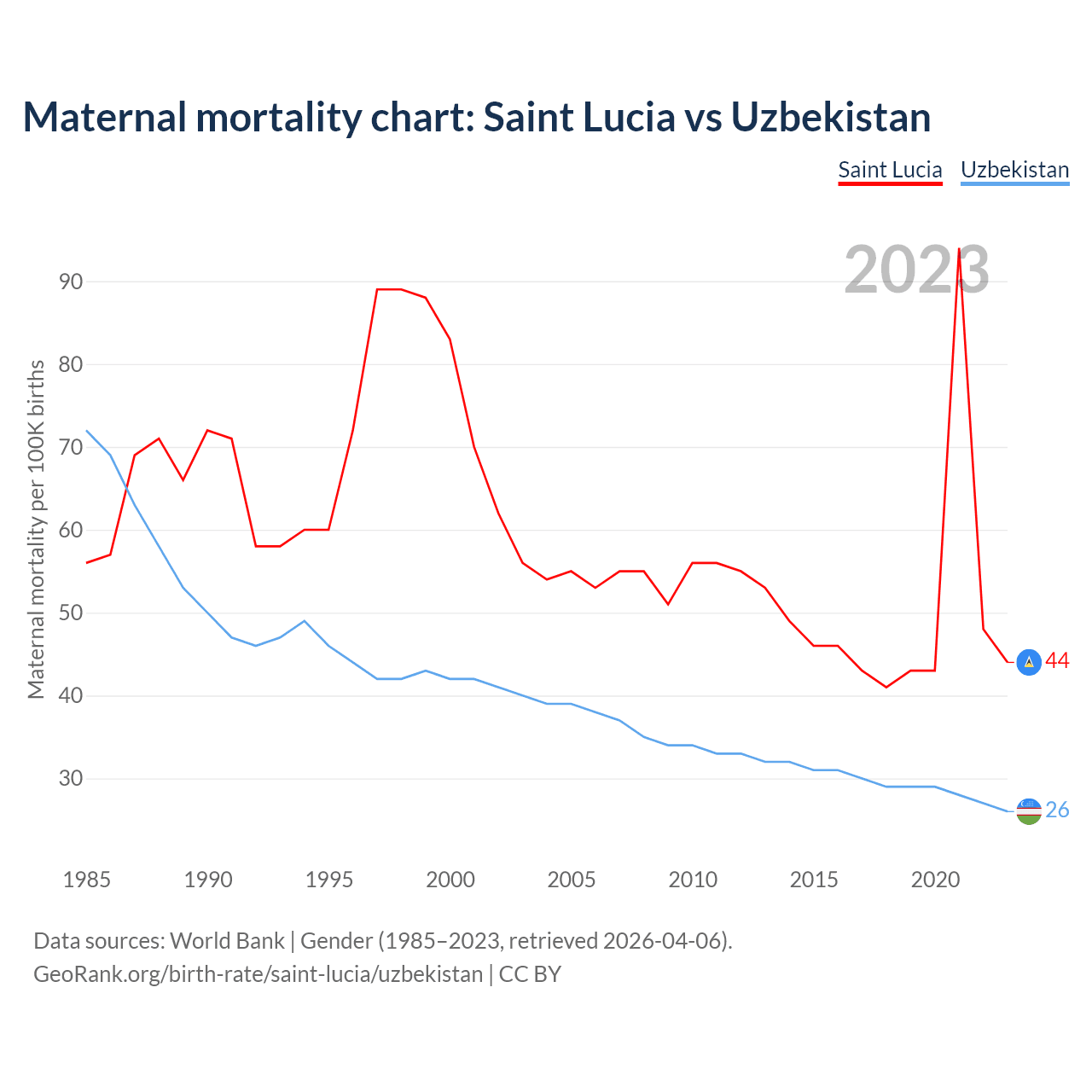 The maternal mortality rate, which is the probability of dying during childbirth or within 42 days of pregnancy termination, is 44 deaths per 100,000 live births in Saint Lucia, compared to 26 deaths in Uzbekistan.