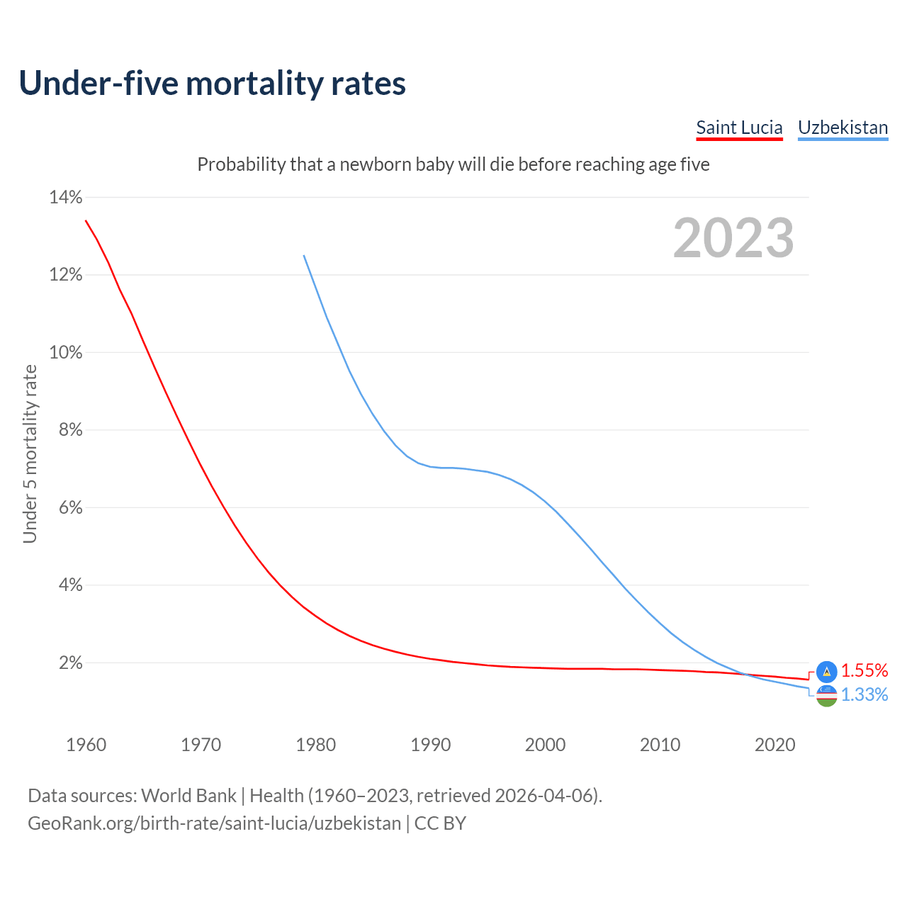 The chance that a newborn baby will die before reaching age five is 1.55% in Saint Lucia and 1.33% in Uzbekistan. Above is a chart with historical data on under-five mortality rates.