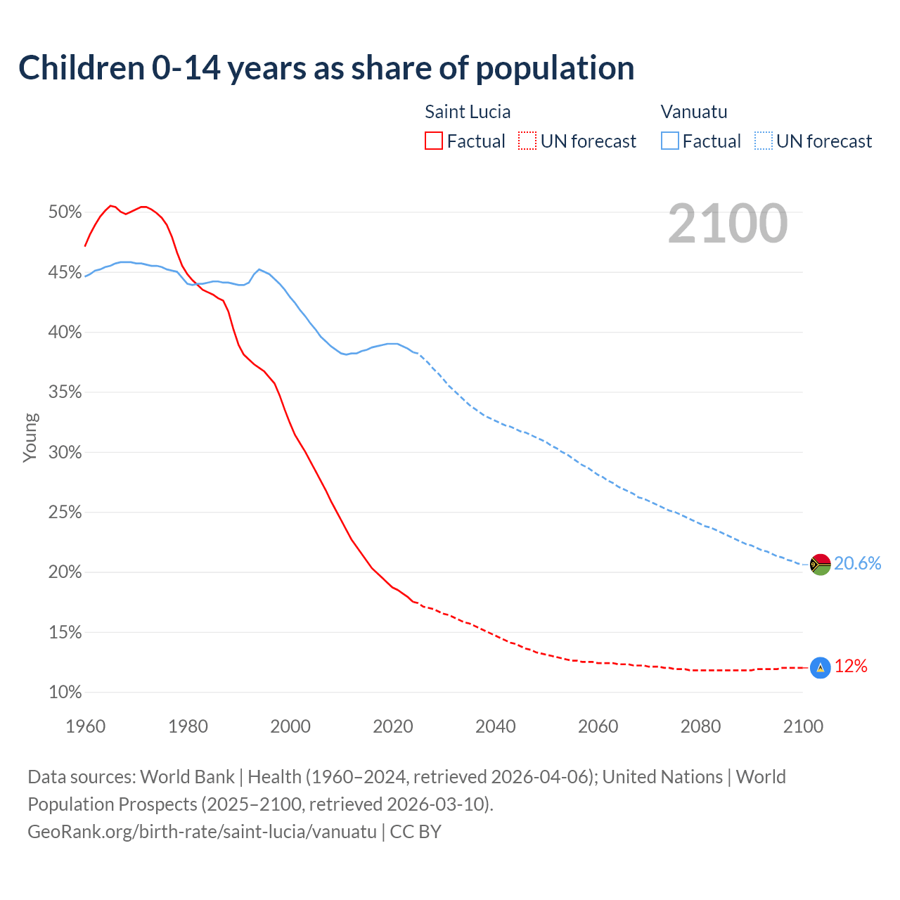 Saint Lucia has an annual birth rate of 11.3 births per 1,000 people, compared to 28.1 for Vanuatu. The average number of children a woman is expected to have during her lifetime — the fertility rate, is 1.38 in Saint Lucia and 3.6 in Vanuatu — 160.8% difference.