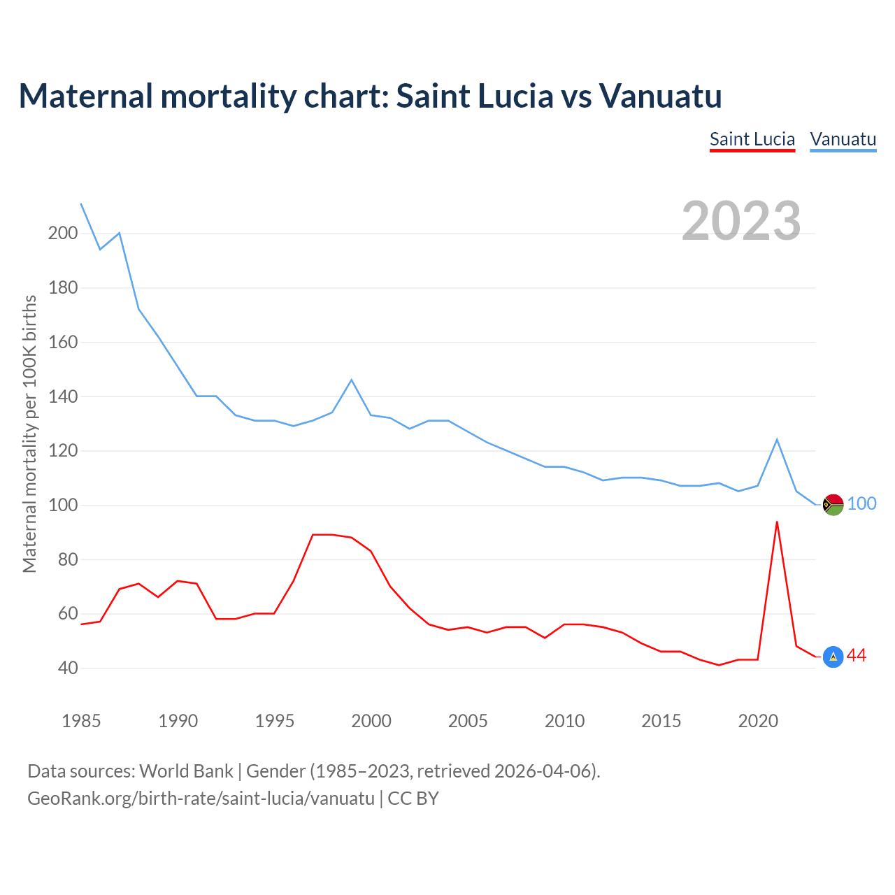 The maternal mortality rate, which is the probability of dying during childbirth or within 42 days of pregnancy termination, is 44 deaths per 100,000 live births in Saint Lucia, compared to 100 deaths in Vanuatu.