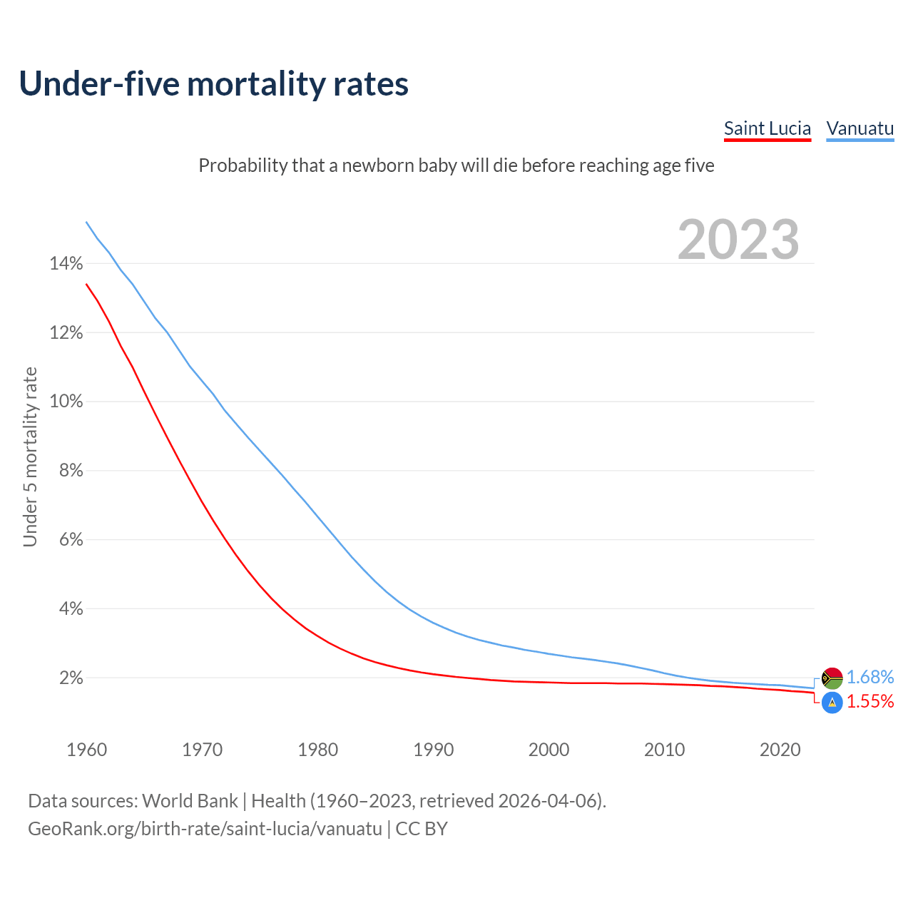 The chance that a newborn baby will die before reaching age five is 1.55% in Saint Lucia and 1.68% in Vanuatu. Above is a chart with historical data on under-five mortality rates.