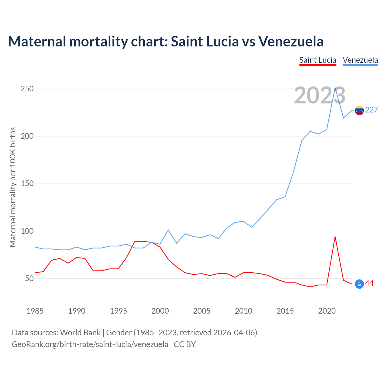 The maternal mortality rate, which is the probability of dying during childbirth or within 42 days of pregnancy termination, is 44 deaths per 100,000 live births in Saint Lucia, compared to 227 deaths in Venezuela.
