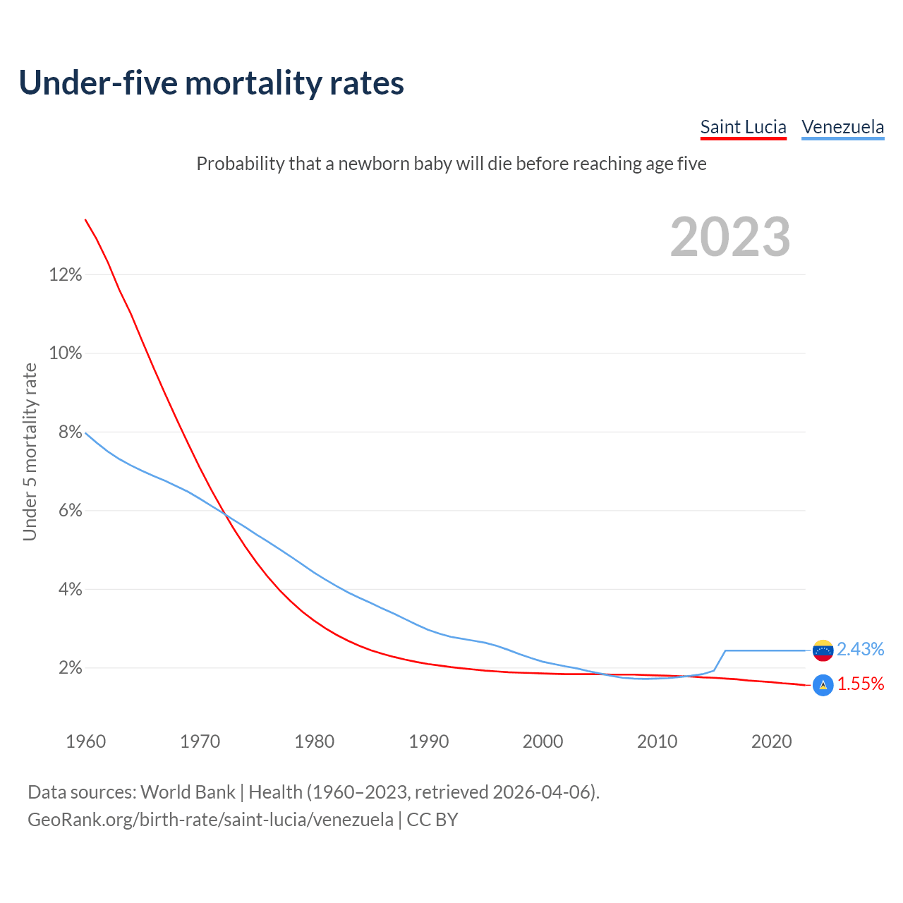 The chance that a newborn baby will die before reaching age five is 1.55% in Saint Lucia and 2.43% in Venezuela. Above is a chart with historical data on under-five mortality rates.