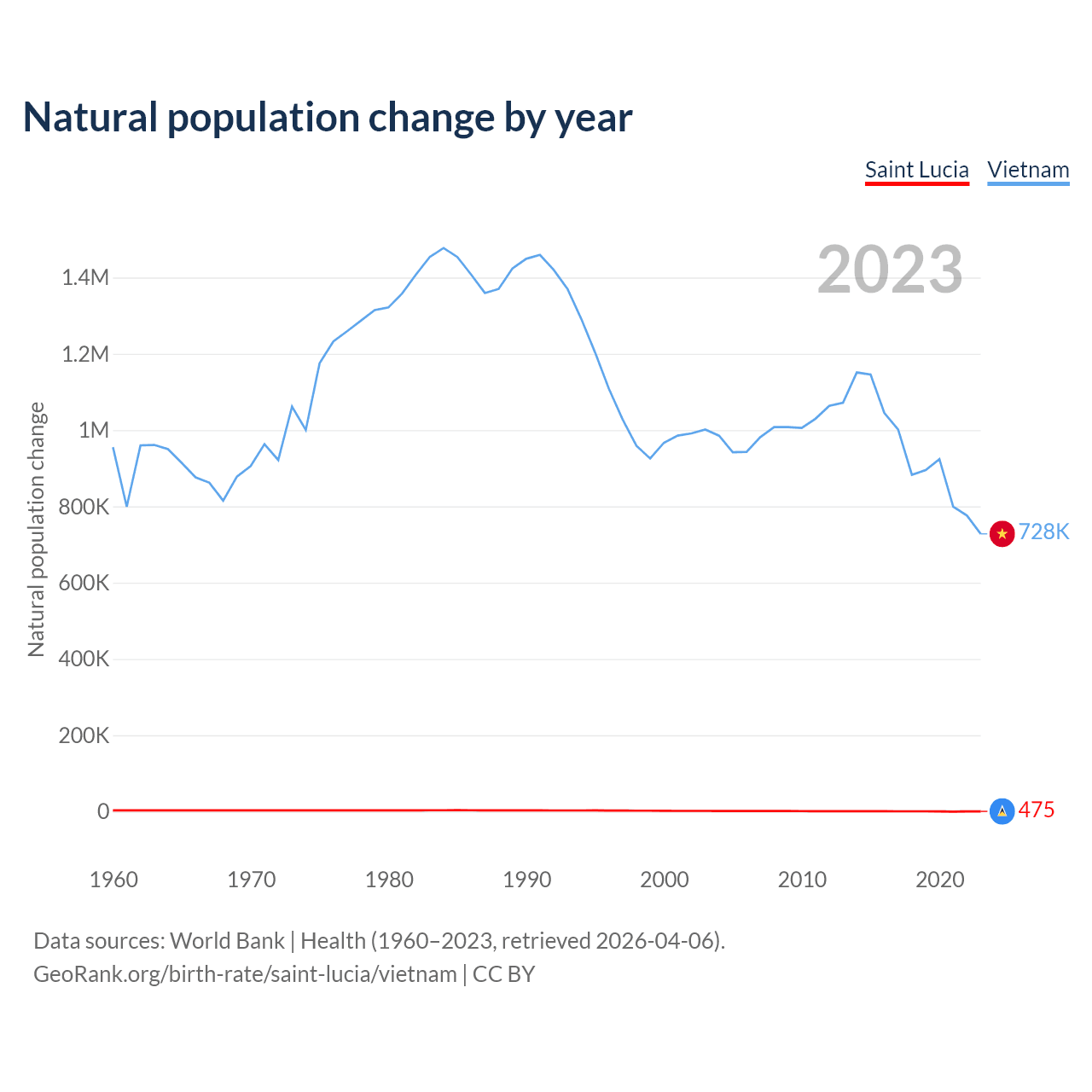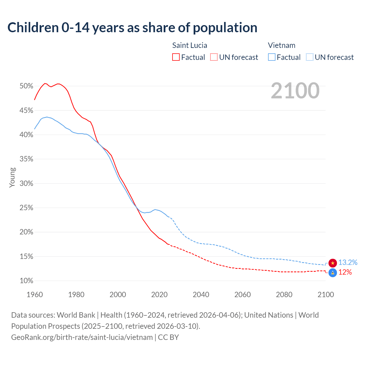 Saint Lucia has an annual birth rate of 11.3 births per 1,000 people, compared to 13.8 for Vietnam. The average number of children a woman is expected to have during her lifetime — the fertility rate, is 1.38 in Saint Lucia and 1.91 in Vietnam — 38.7% difference.