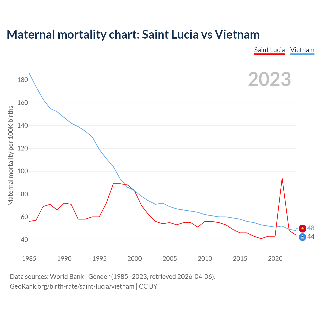 The maternal mortality rate, which is the probability of dying during childbirth or within 42 days of pregnancy termination, is 44 deaths per 100,000 live births in Saint Lucia, compared to 48 deaths in Vietnam.
