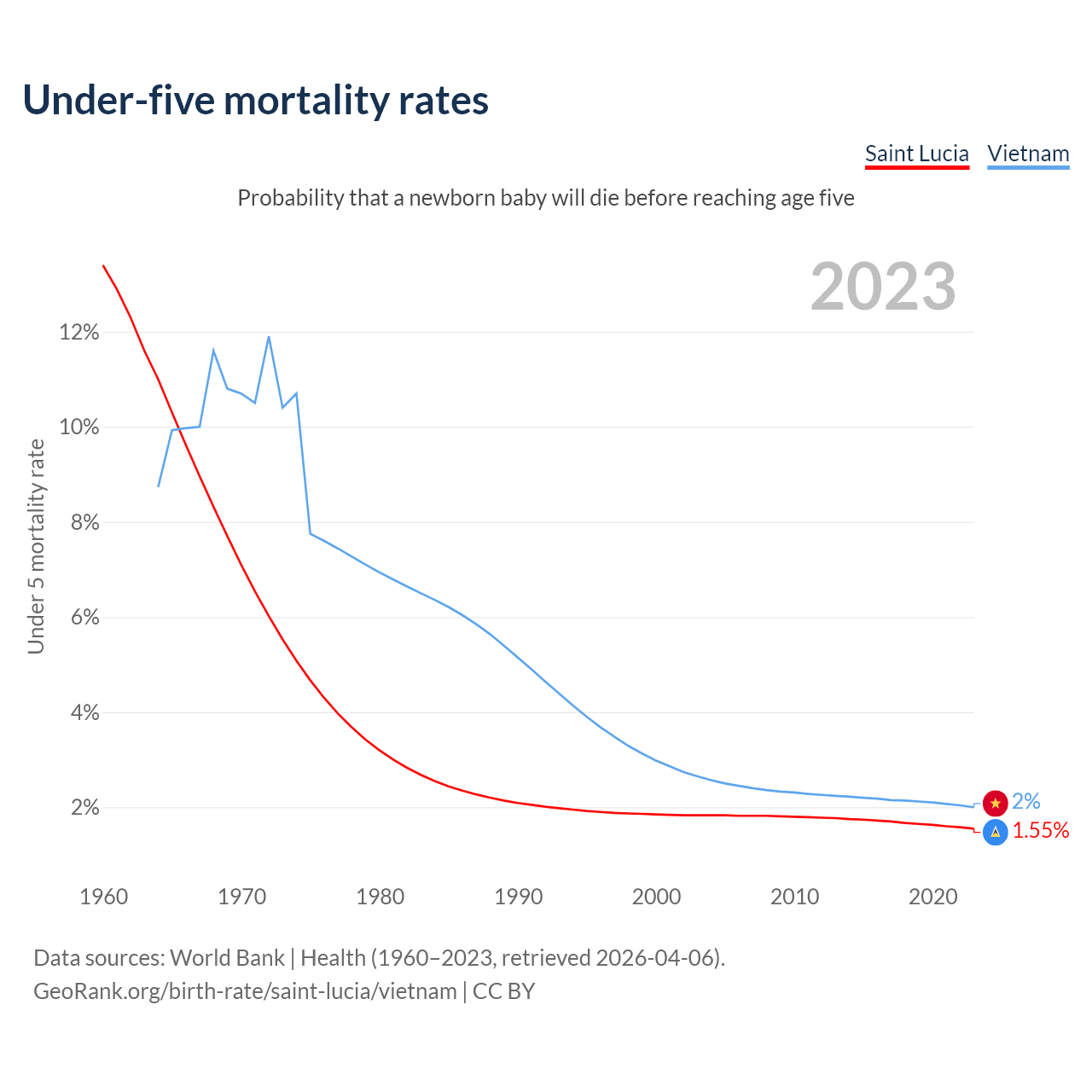 The chance that a newborn baby will die before reaching age five is 1.55% in Saint Lucia and 2% in Vietnam. Above is a chart with historical data on under-five mortality rates.