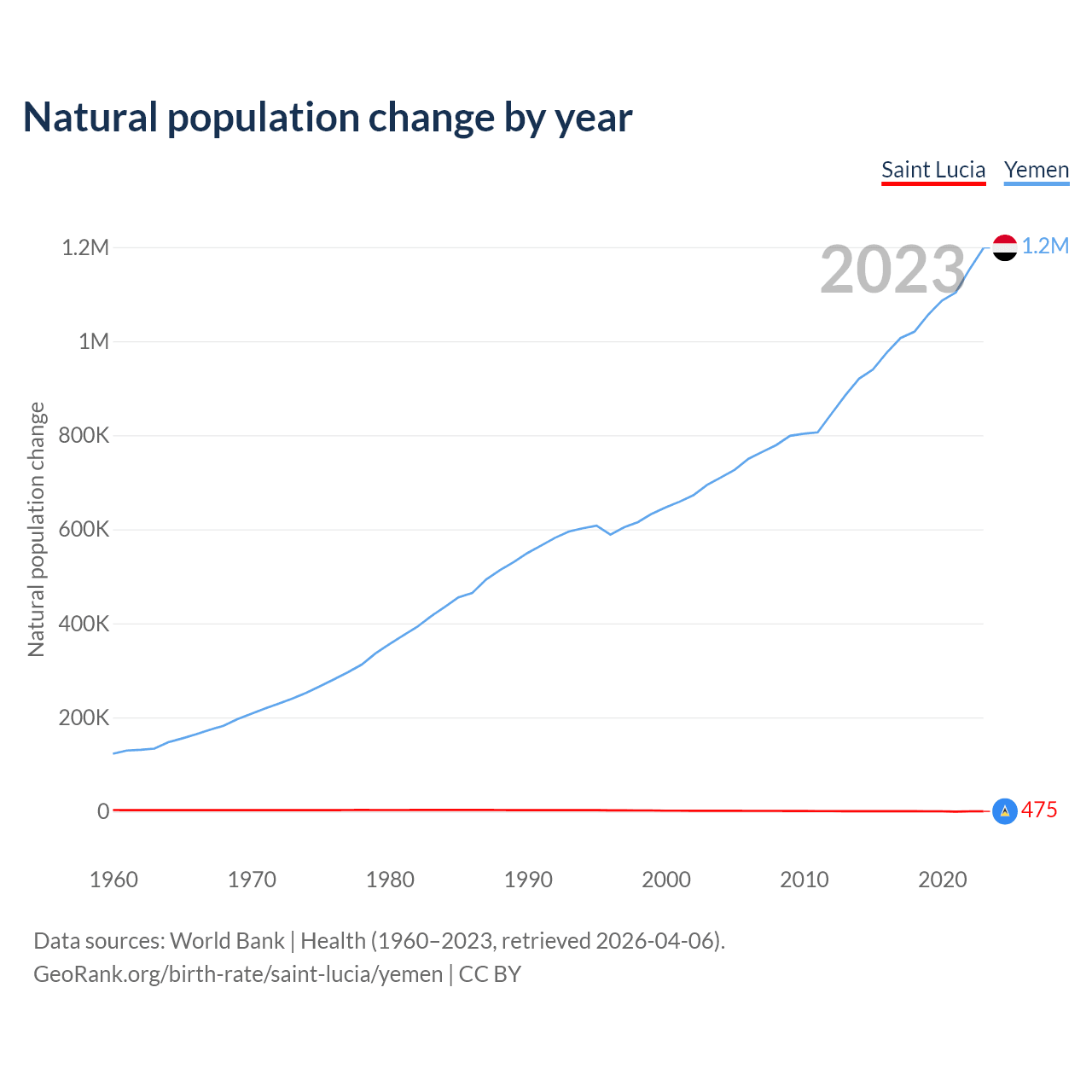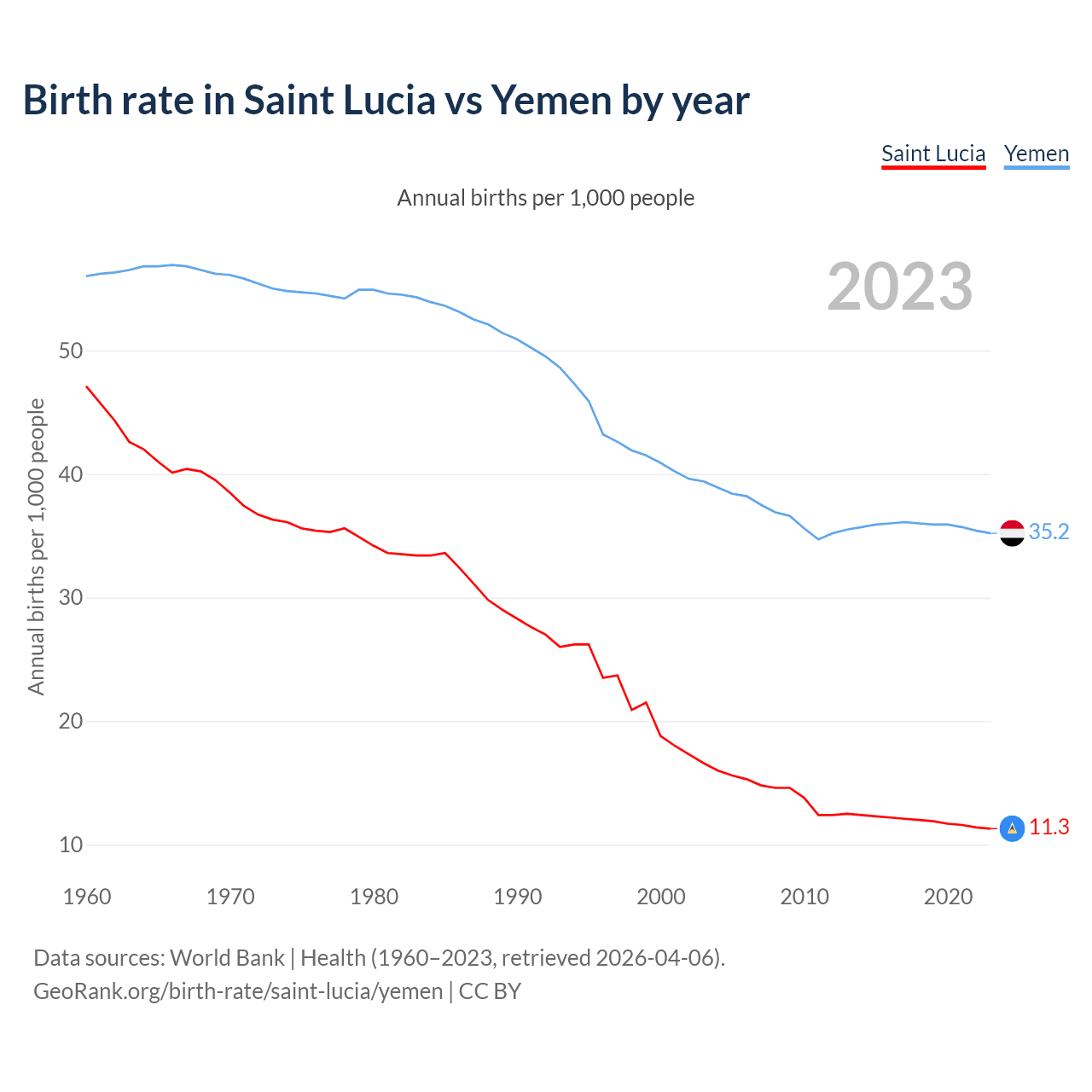 Saint Lucia has an annual birth rate of 11.3 births per 1,000 people, compared to 35.2 for Yemen. The average number of children a woman is expected to have during her lifetime — the fertility rate, is 1.38 in Saint Lucia and 4.59 in Yemen — 232.8% difference.