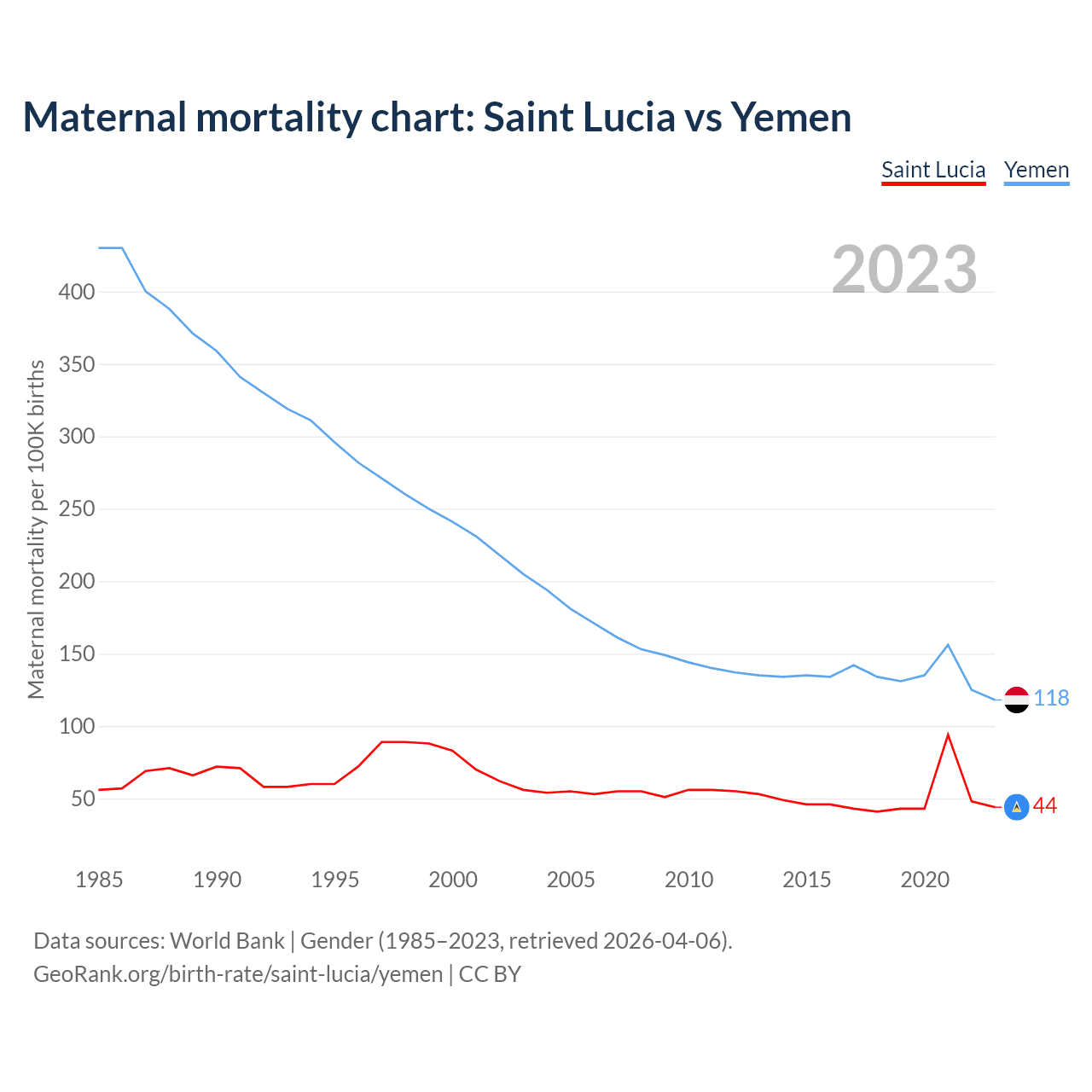The maternal mortality rate, which is the probability of dying during childbirth or within 42 days of pregnancy termination, is 44 deaths per 100,000 live births in Saint Lucia, compared to 118 deaths in Yemen.