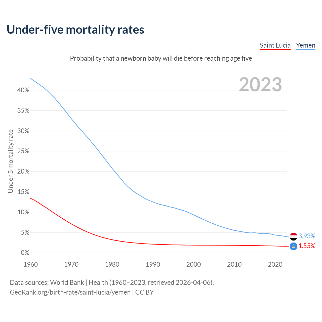The chance that a newborn baby will die before reaching age five is 1.55% in Saint Lucia and 3.93% in Yemen. Above is a chart with historical data on under-five mortality rates.