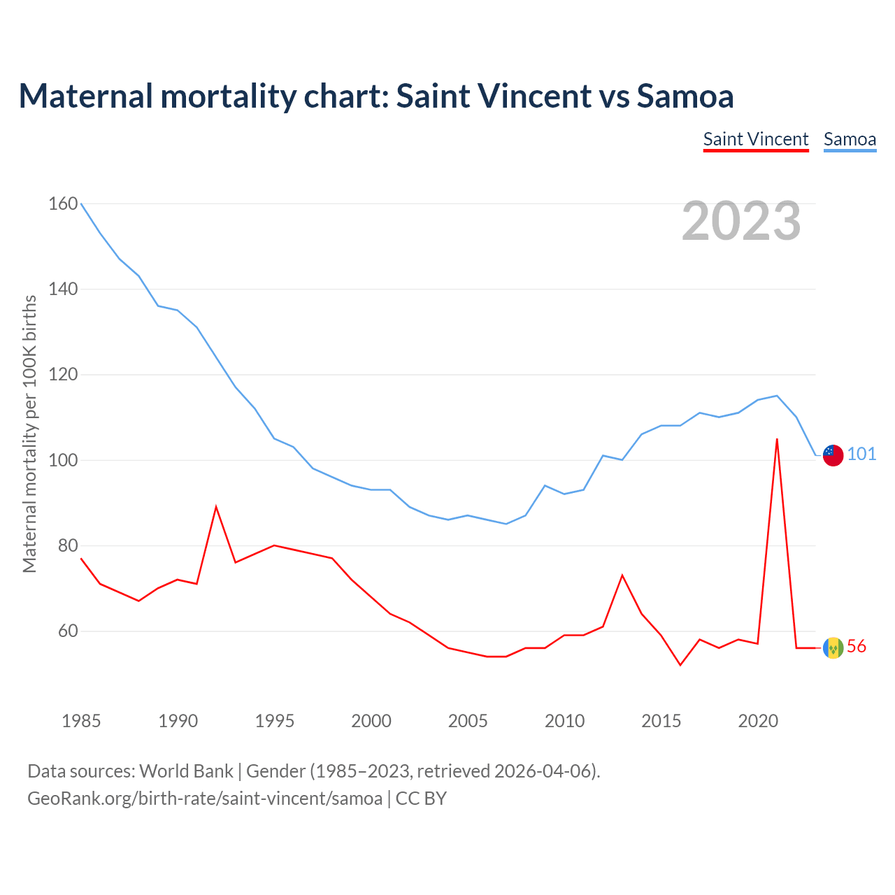 The maternal mortality rate, which is the probability of dying during childbirth or within 42 days of pregnancy termination, is 56 deaths per 100,000 live births in Saint Vincent, compared to 101 deaths in Samoa.