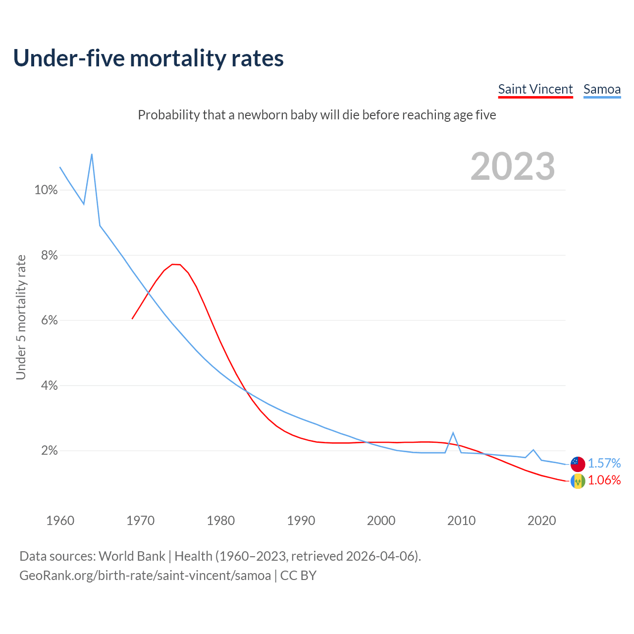 The chance that a newborn baby will die before reaching age five is 1.06% in Saint Vincent and 1.57% in Samoa. Above is a chart with historical data on under-five mortality rates.