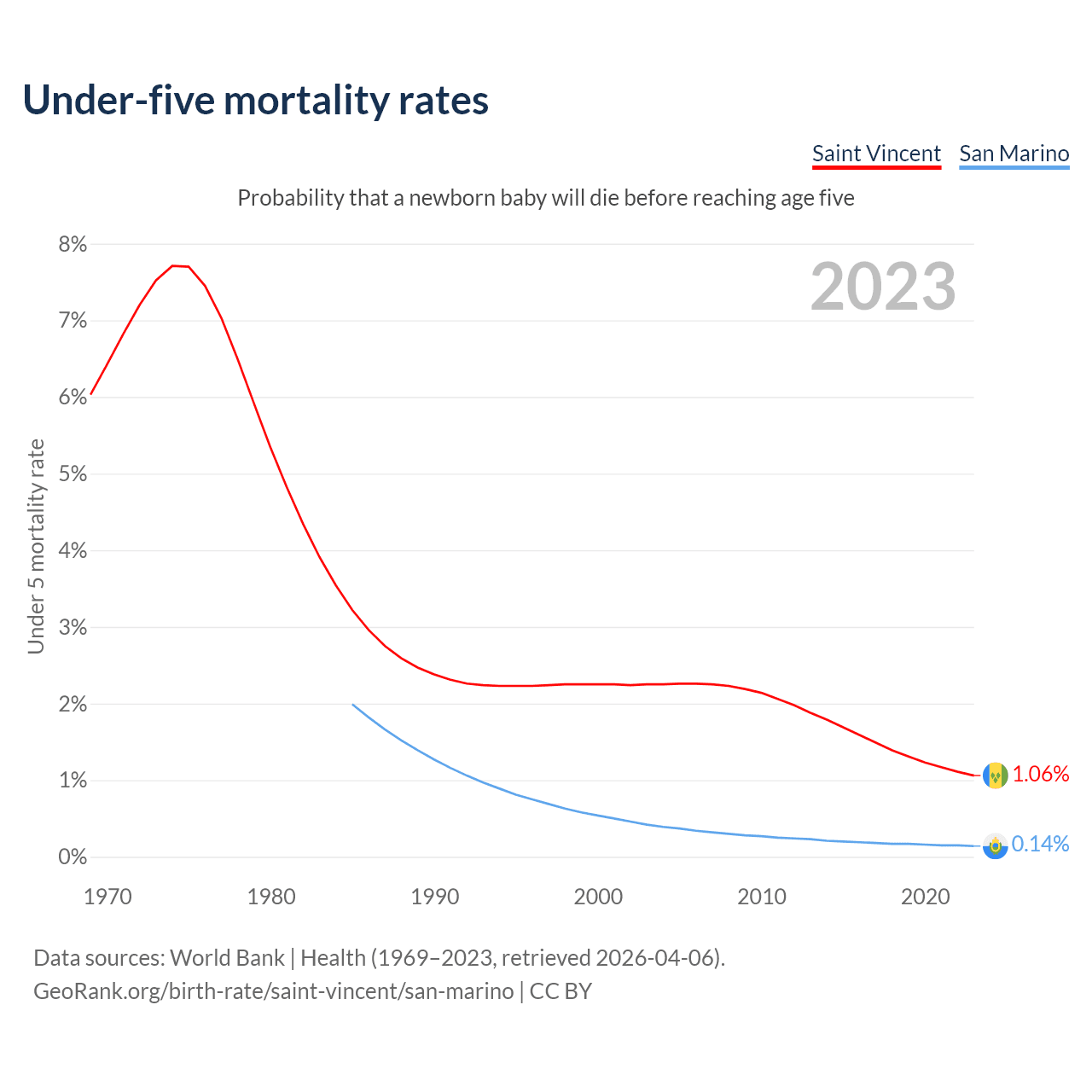 The chance that a newborn baby will die before reaching age five is 1.06% in Saint Vincent and 0.14% in San Marino. Above is a chart with historical data on under-five mortality rates.