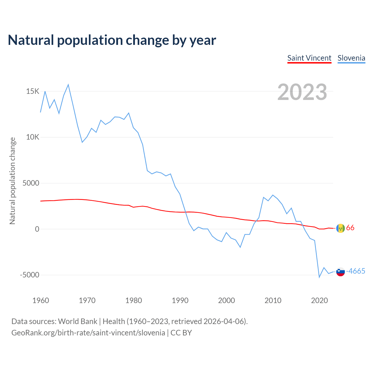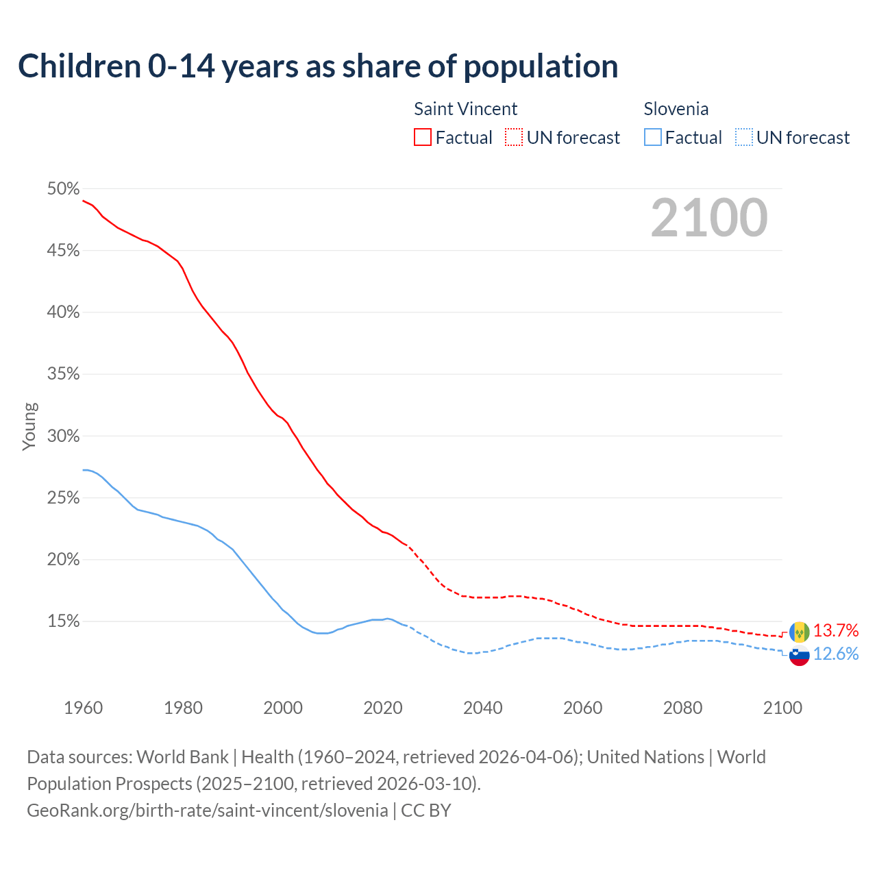 According to the latest available data on birth rates, the fertility rate in Saint Vincent was 1.78 children per woman in 2023, compared to 1.51 in Slovenia in 2023. The replacement level is considered to be 2.1 children per woman.