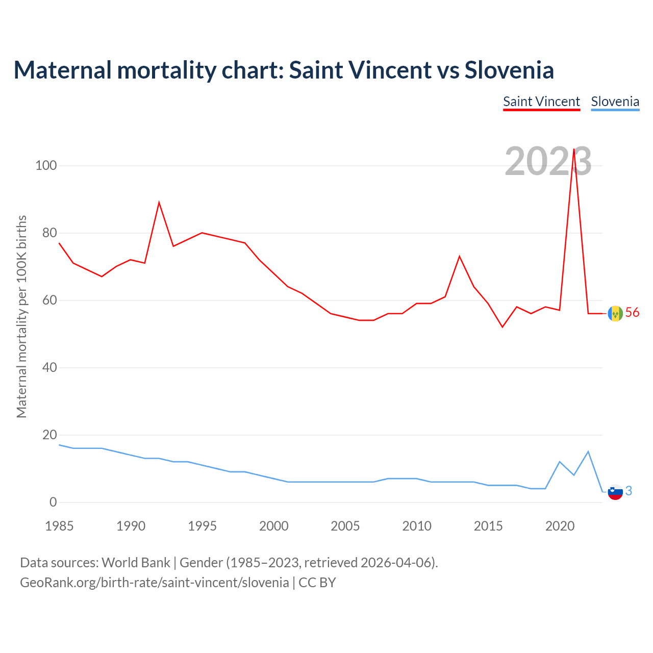 The maternal mortality rate, which is the probability of dying during childbirth or within 42 days of pregnancy termination, is 56 deaths per 100,000 live births in Saint Vincent, compared to 3 deaths in Slovenia.