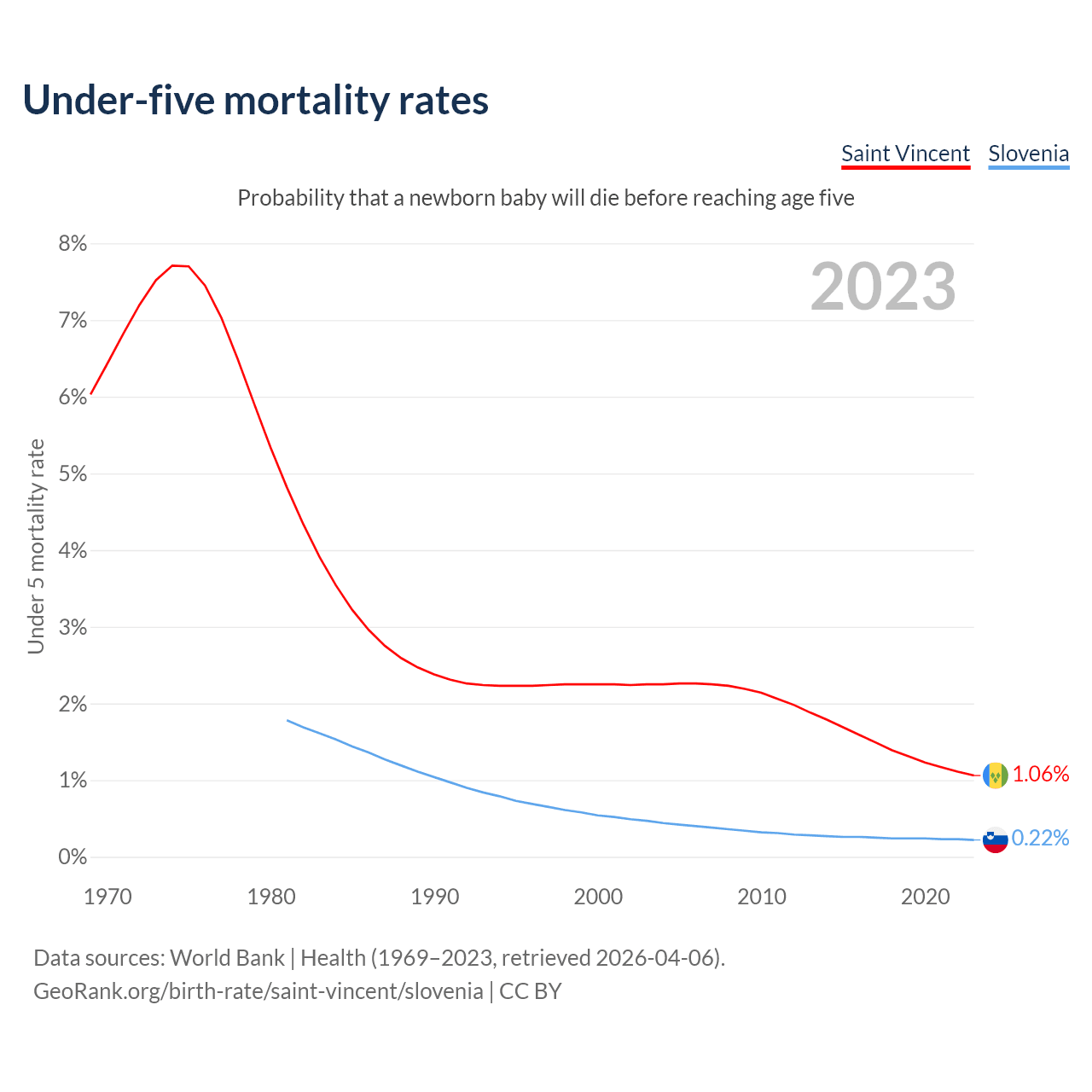 The chance that a newborn baby will die before reaching age five is 1.06% in Saint Vincent and 0.22% in Slovenia. Above is a chart with historical data on under-five mortality rates.