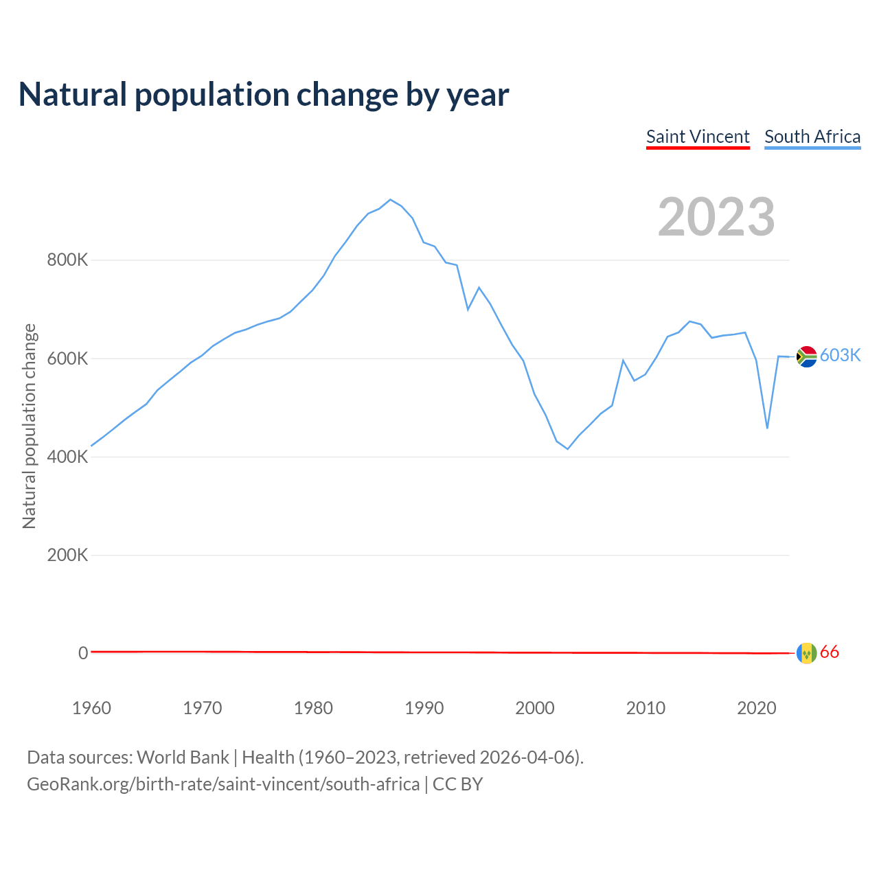 According to the latest available data on birth rates, the fertility rate in Saint Vincent was 1.78 children per woman in 2023, compared to 2.22 in South Africa in 2023. The replacement level is considered to be 2.1 children per woman.