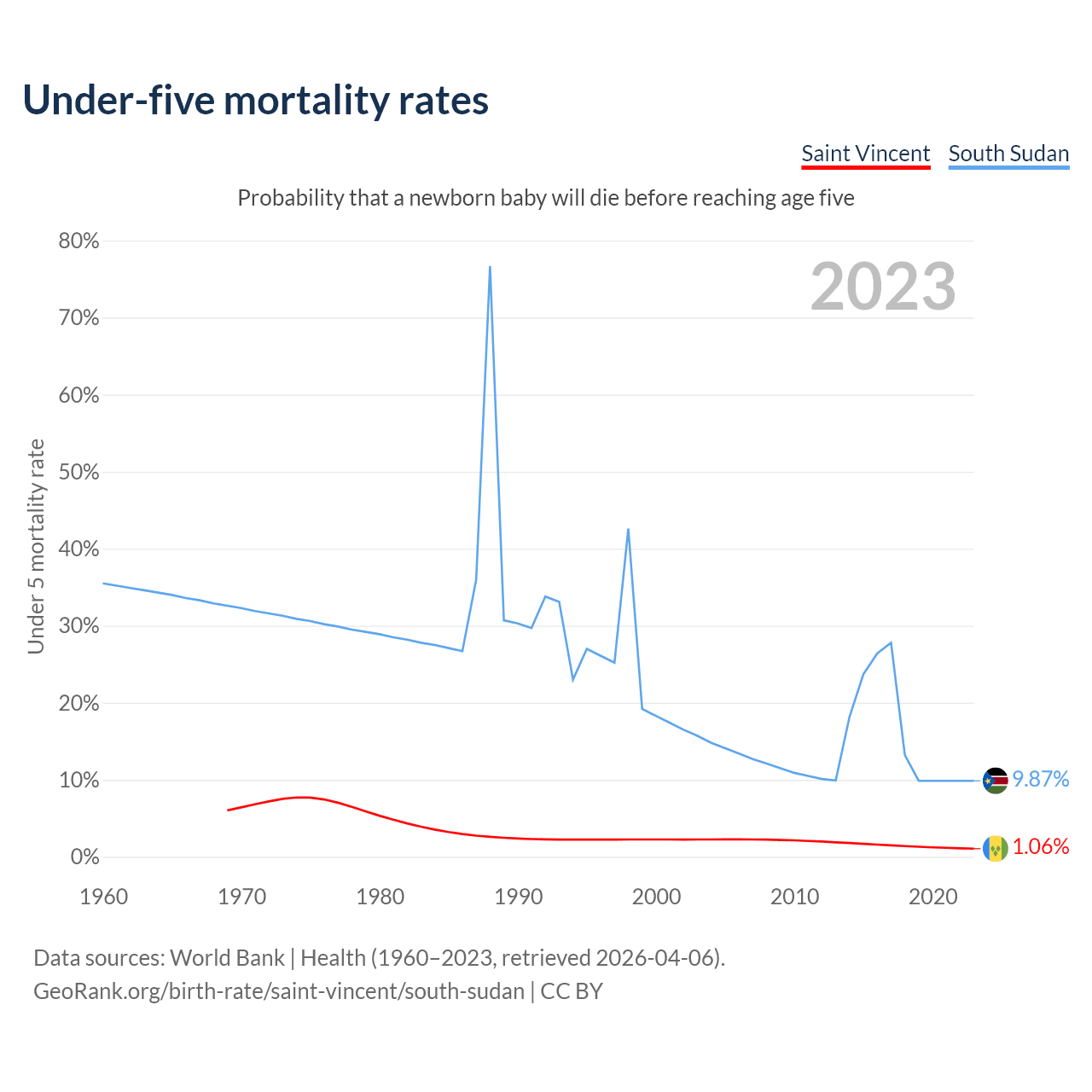 The chance that a newborn baby will die before reaching age five is 1.06% in Saint Vincent and 9.87% in South Sudan. Above is a chart with historical data on under-five mortality rates.