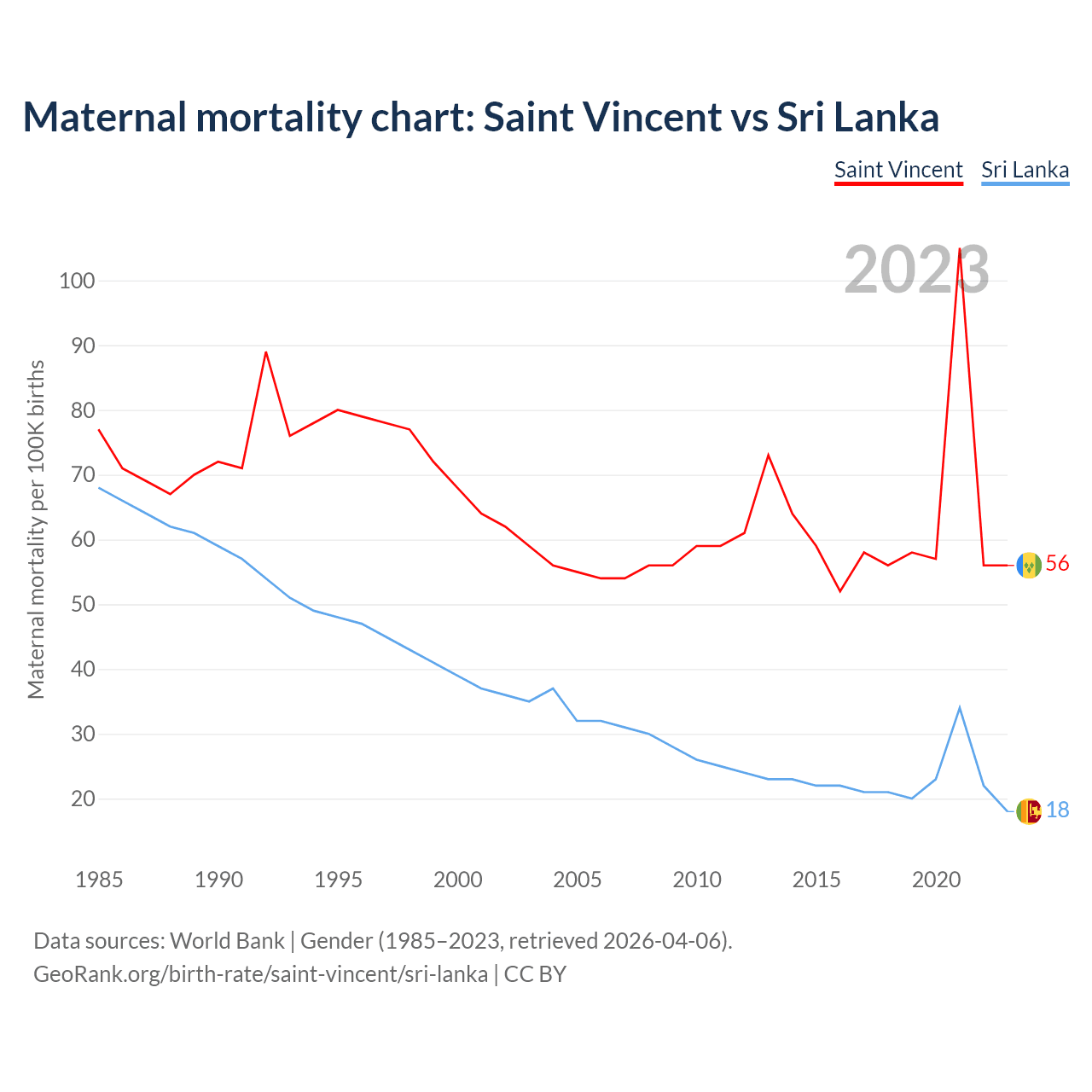 The maternal mortality rate, which is the probability of dying during childbirth or within 42 days of pregnancy termination, is 56 deaths per 100,000 live births in Saint Vincent, compared to 18 deaths in Sri Lanka.