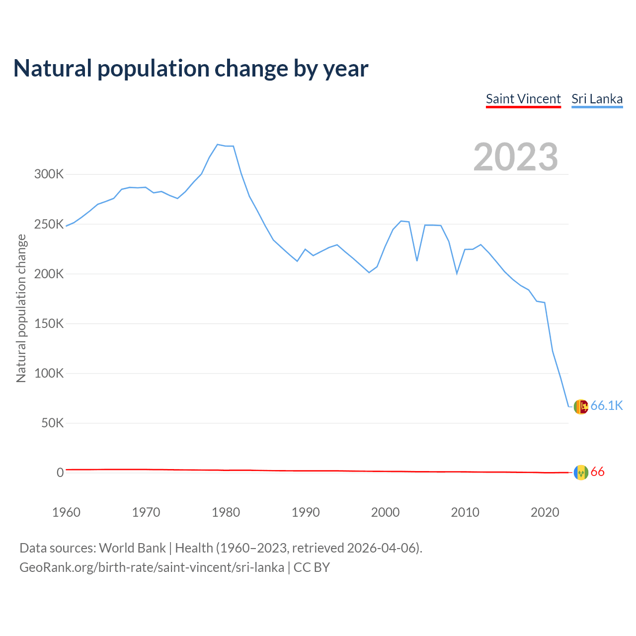 According to the latest available data on birth rates, the fertility rate in Saint Vincent was 1.78 children per woman in 2023, compared to 1.97 in Sri Lanka in 2023. The replacement level is considered to be 2.1 children per woman.