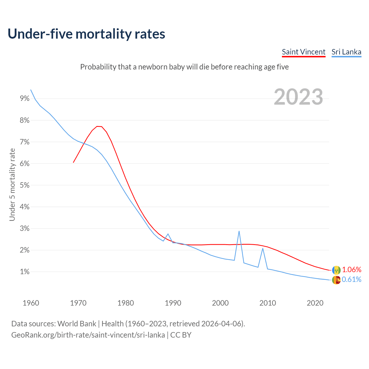 The chance that a newborn baby will die before reaching age five is 1.06% in Saint Vincent and 0.61% in Sri Lanka. Above is a chart with historical data on under-five mortality rates.